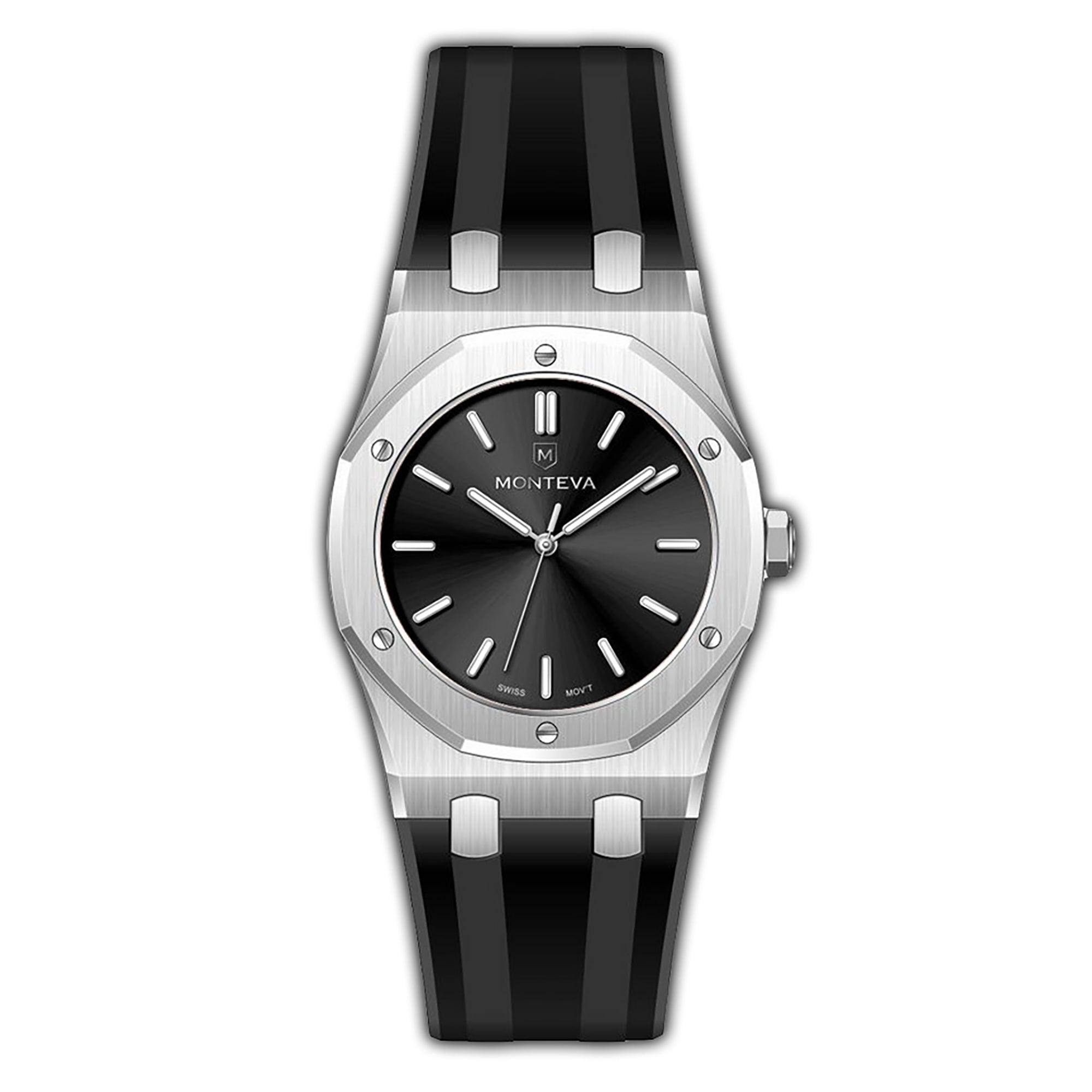 The Monteva M763EB is a stylish and contemporary timepiece featuring a sleek stainless steel case and a comfortable black rubber strap. The watch showcases a black dial with index markers, adding a touch of sophistication. The black dial and case create a cohesive and modern aesthetic. With its reliable Swiss movement and water resistance, the Monteva M763EB is perfect for everyday wear.