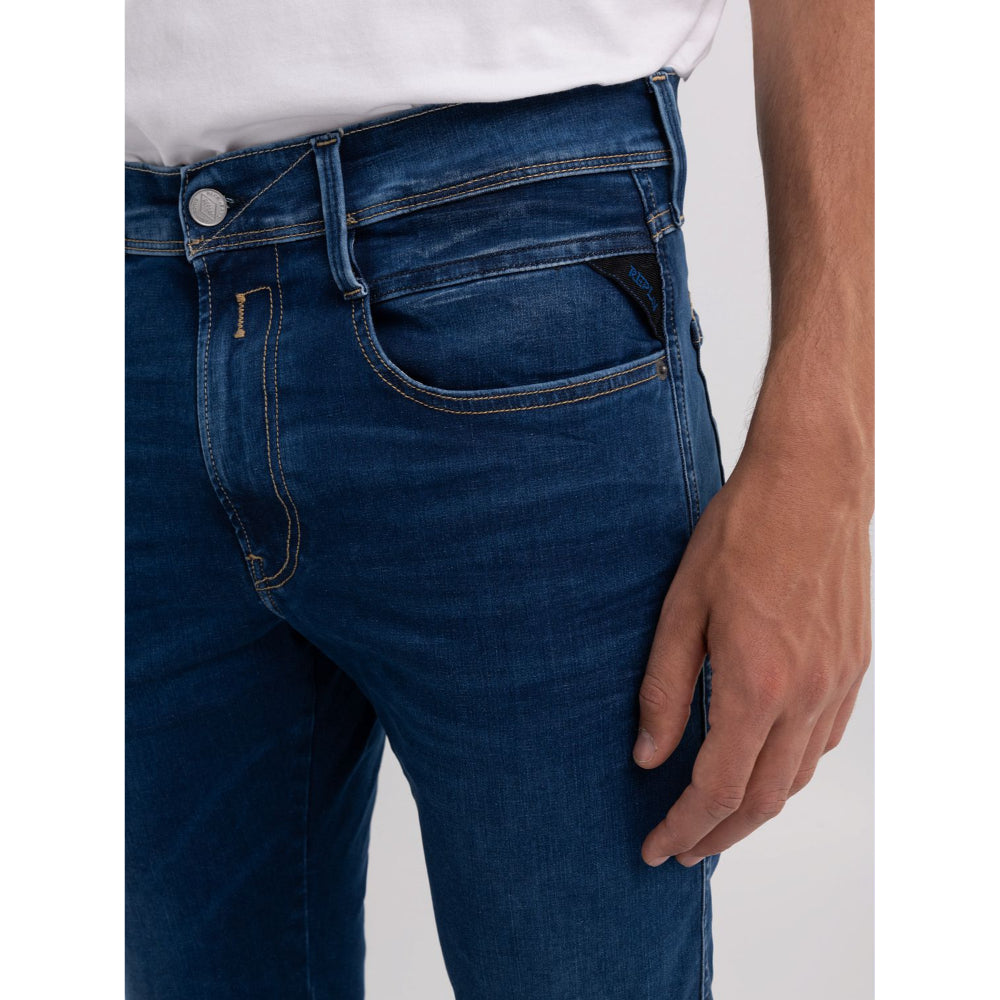 Super slim fit jeans with regular waist and tapered leg. The garment is made of 10,5 oz extra light ocean blue Hyperflex Re-used denim with a dark wash tone suitable for all seasons. The five pockets item is characterized by the scrapings treatment which creates abrasions on the edges and at the hem with soft contrasting colors on used areas. It features a zip and button fly.