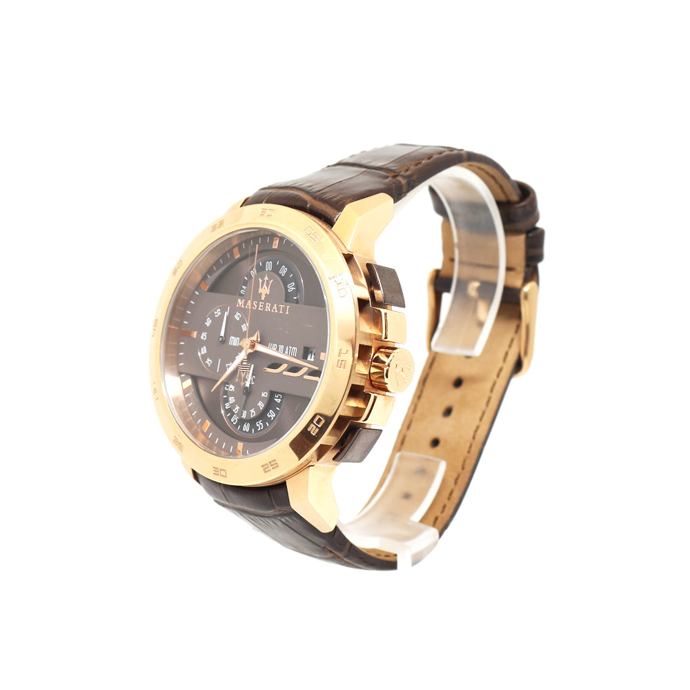 ساعة مازيراتي انجينجو من الستيل قياس 45 مع كرونوغراف وميناْ لون بني مع جلد بني وبلون ذهبي وردي