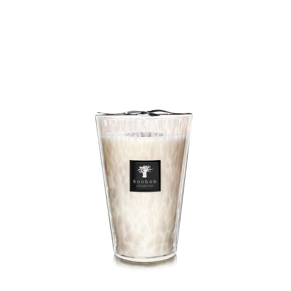 For many centuries, white pearls have been seen as symbols of purity and love. Sprinkled with light pink and white fragments, the White Pearls scented candle is inspired by the perfection of the pearl, also known as Òtears of the gods.Ó The delicate and floral scent of White Pearls, made up of white musk and jasmine, references the feminine quality of white pearls.