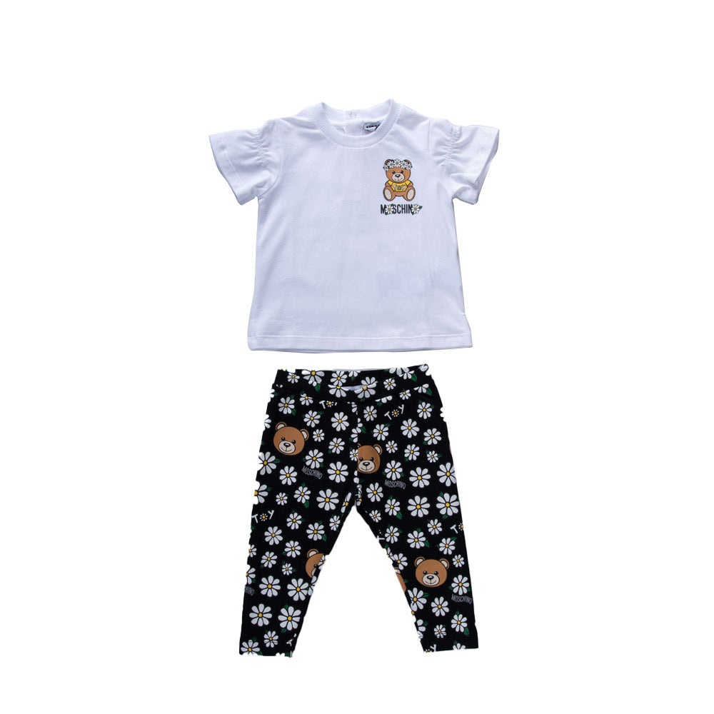 This Moschino Black Toy Daisy T-shirt & Leggings Set is a stylish and fun choice for your little girl. The classic black color and cute teddy bear and daisy motif make it perfect for special occasions or everyday wear. The stretchy cotton jersey fabric is soft to the touch and comfortable to wear, and the round neck and button back help to make dressing easier. The elasticated sleeves and leggings are also soft and comfortable to move in and feature an all-over print for a bold statement. Whether it's worn alone or with a skirt, dress, or other items, this Moschino set is sure to add a splash of style to any wardrobe. SPECIFICATIONS
