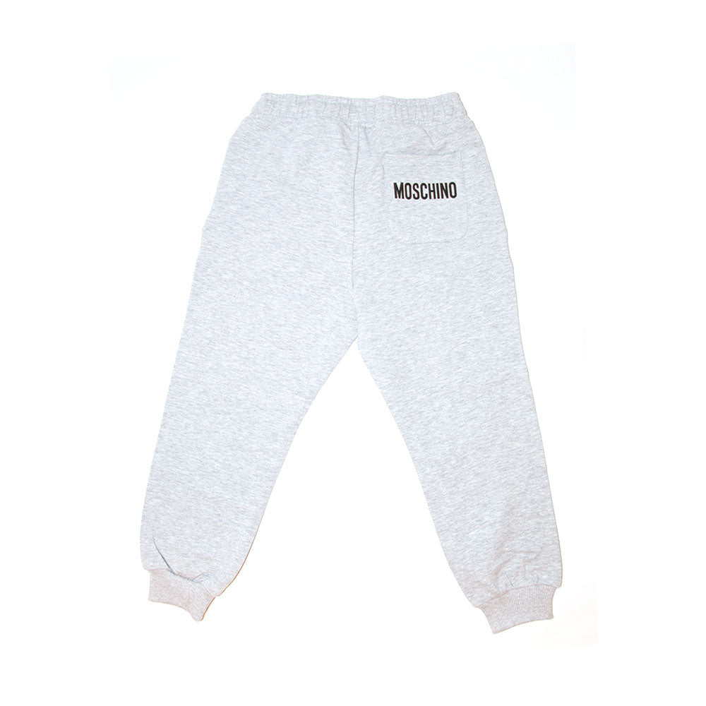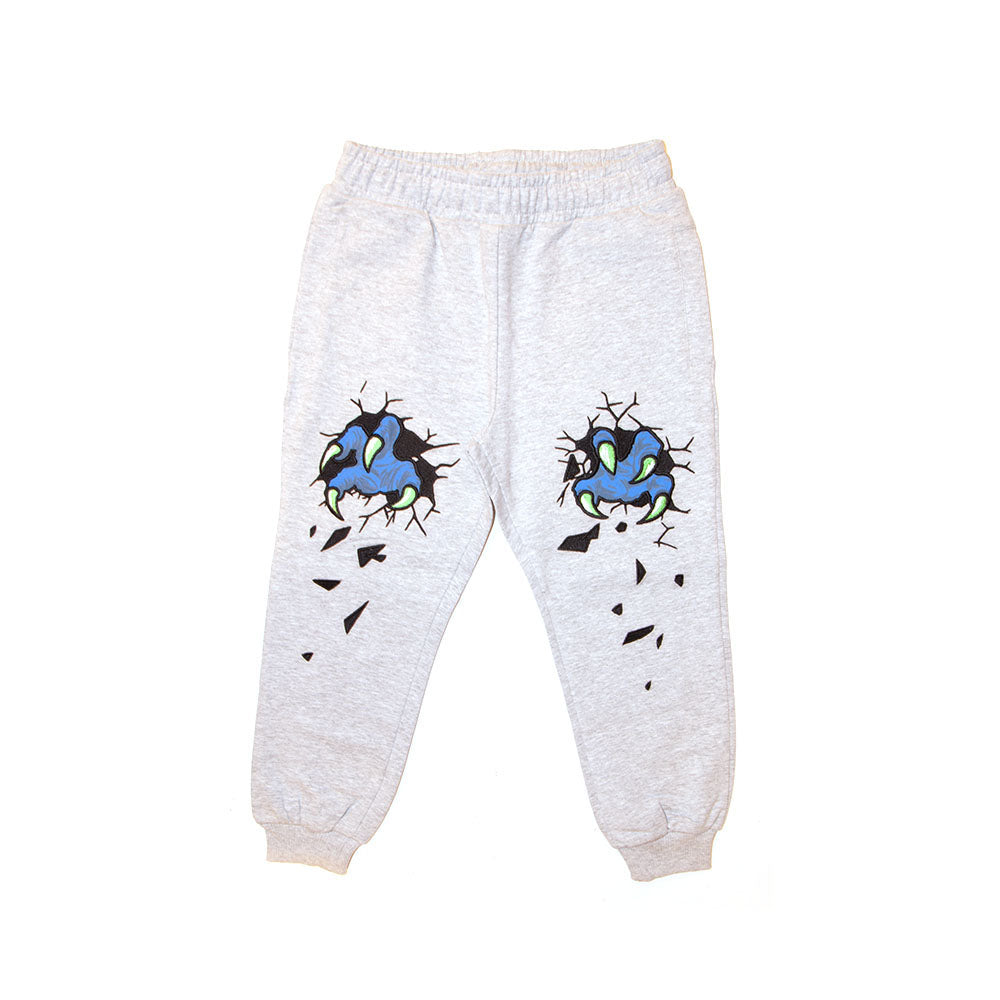 بنطلون رمادي للأولاد من موسكينو كيد-تين ، مصنوع من جيرسي قطن خفيف الوزن. لديهم أربطة داخل حزام الخصر المطاطي. لها شعار أسود جريء مطبوع على الجيب الخلفي ومخالب وحش زرقاء وخضراء مطرزة على قدمين.