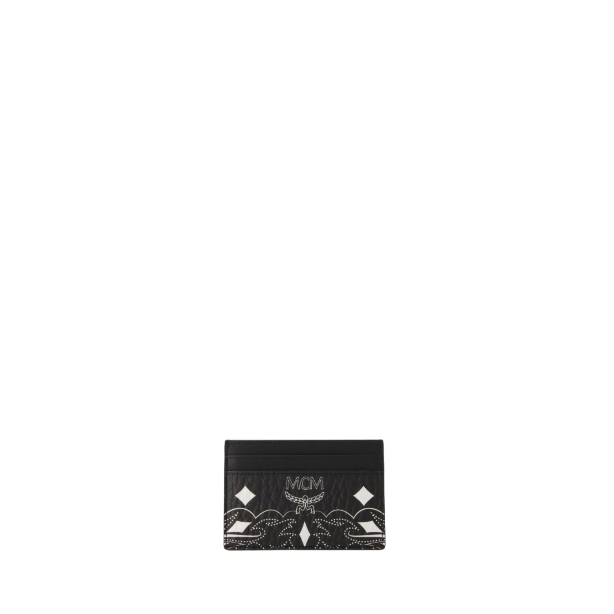 Black 'Aren VI Card Case' from the brand MCM Worldiwde. The signature Visetos monogram leaves a lasting impression on this card holder made of full-grain nappa leather. This artisanal accessory features slots on both sides and a central compartment for banknotes.