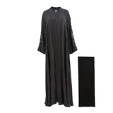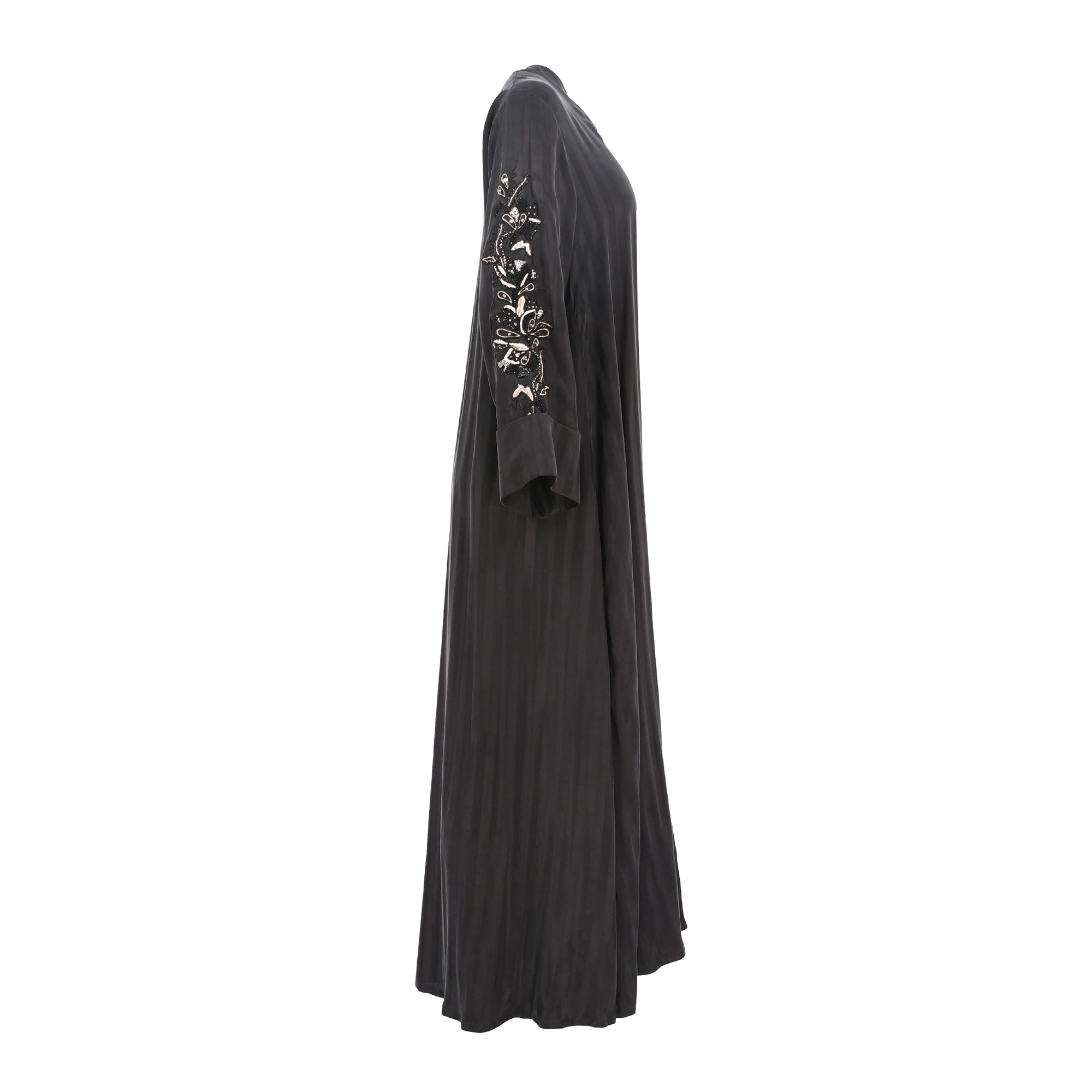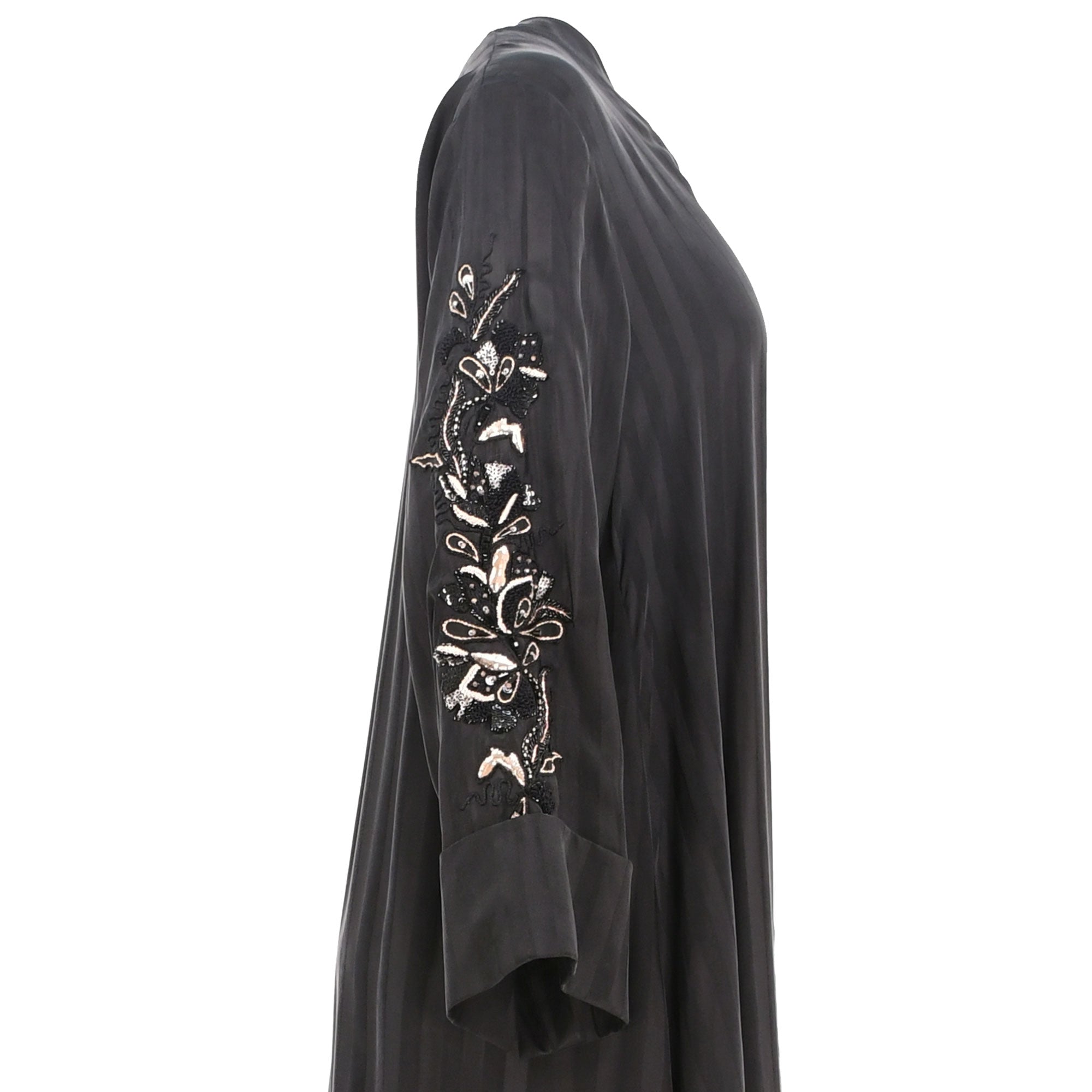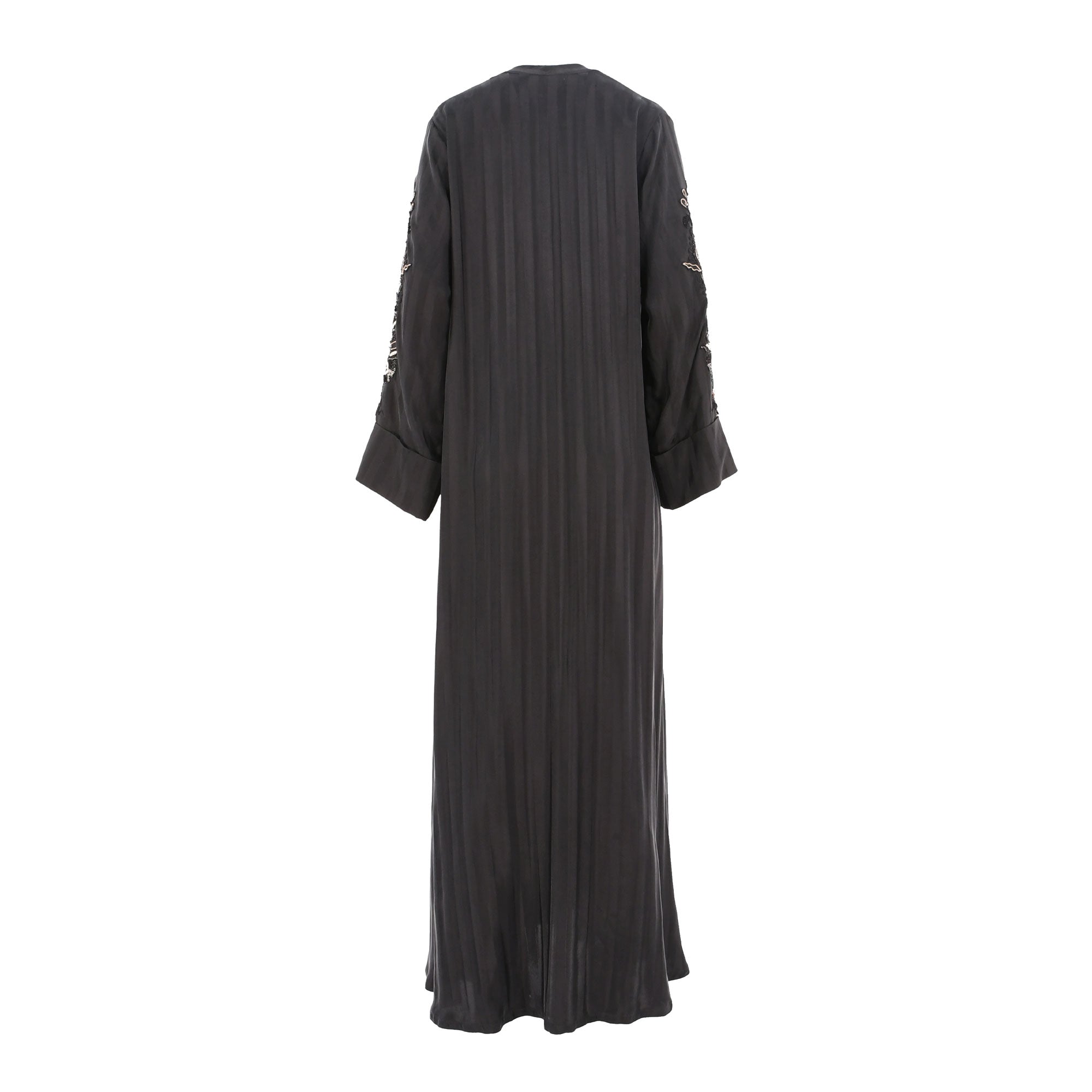 | This N Design Women's black and gold Hand Embroidered Black Abaya is a perfect choice for any occasion. It features a v neck, front closure, and long sleeves. The black and gold embroidery on the sleeves adds a touch of elegance to the abaya. The black color makes it perfect for any occasion, from formal to casual. The fabric is lightweight and breathable, making it comfortable to wear all day long. The abaya is also easy to care for, as it can be machine washed and dried. This abaya is sure to become a staple in your wardrobe. SPECIFICATIONS: