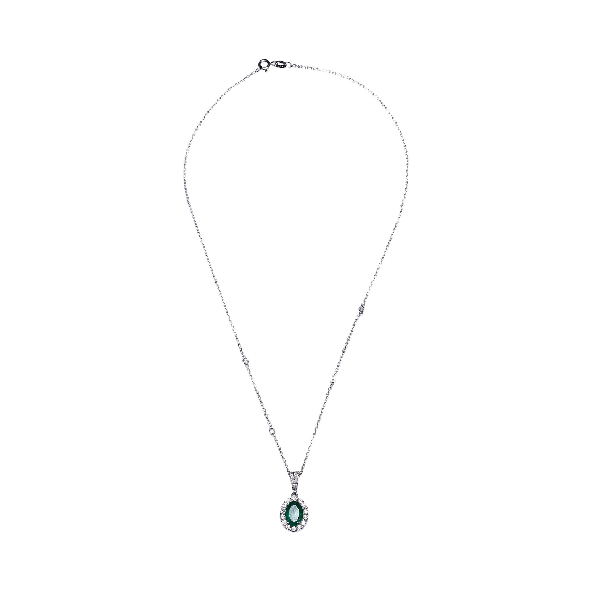 This elegant pendant necklace from Ouzounian Jewelry features a captivating oval-shaped emerald surrounded by a halo of sparkling diamonds. The intricate design and high-quality craftsmanship make this necklace a truly unique and eye-catching piece. The pendant is suspended from a delicate chain, adding to its overall elegance.