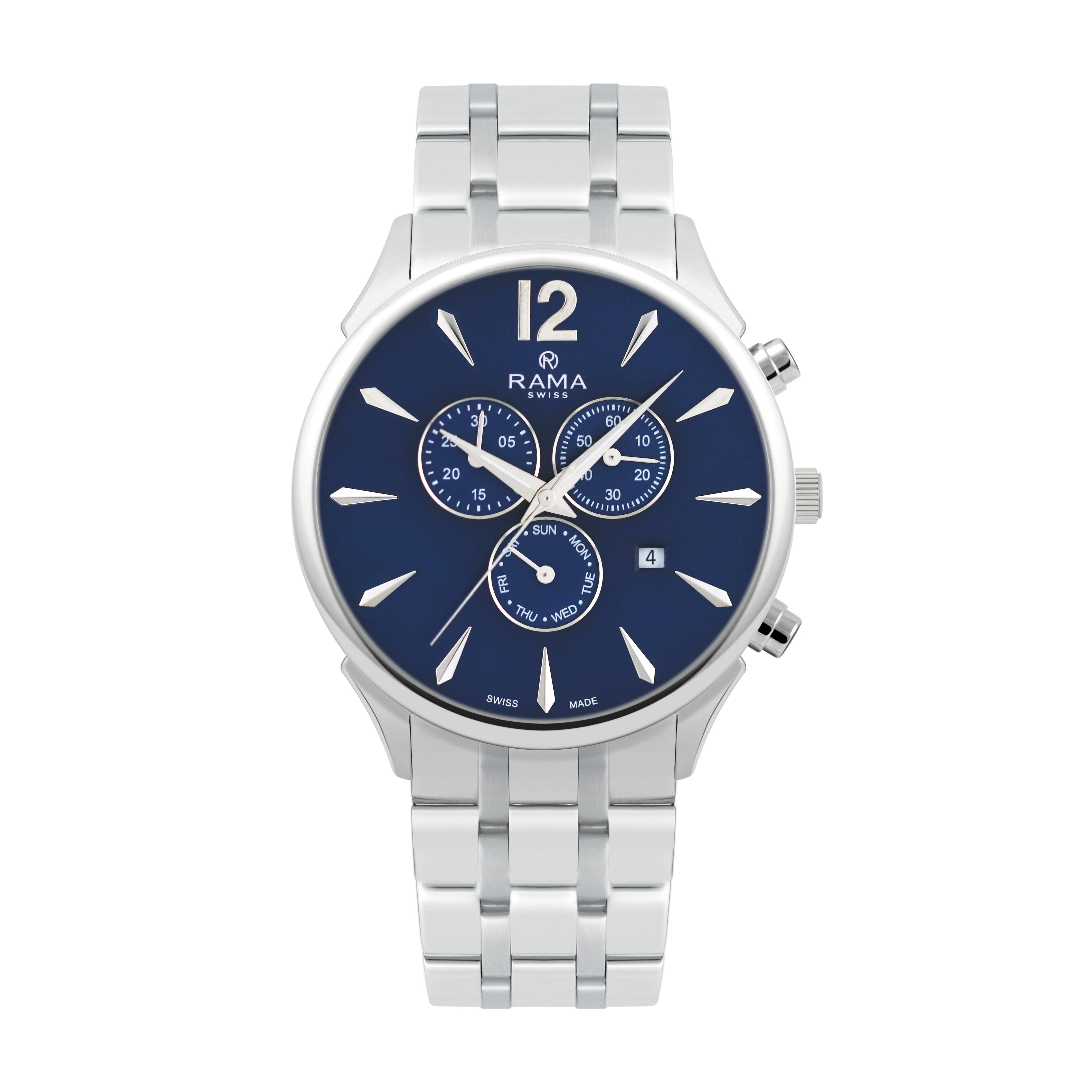 Elevate your style with the RAMA RAC200-SS-9 Men's Chronograph Watch. This sophisticated timepiece features a captivating blue dial with a chronograph function for precise timing. The stainless steel case and bracelet add a touch of modern elegance. Powered by precise Swiss quartz movement, this watch ensures accurate timekeeping.