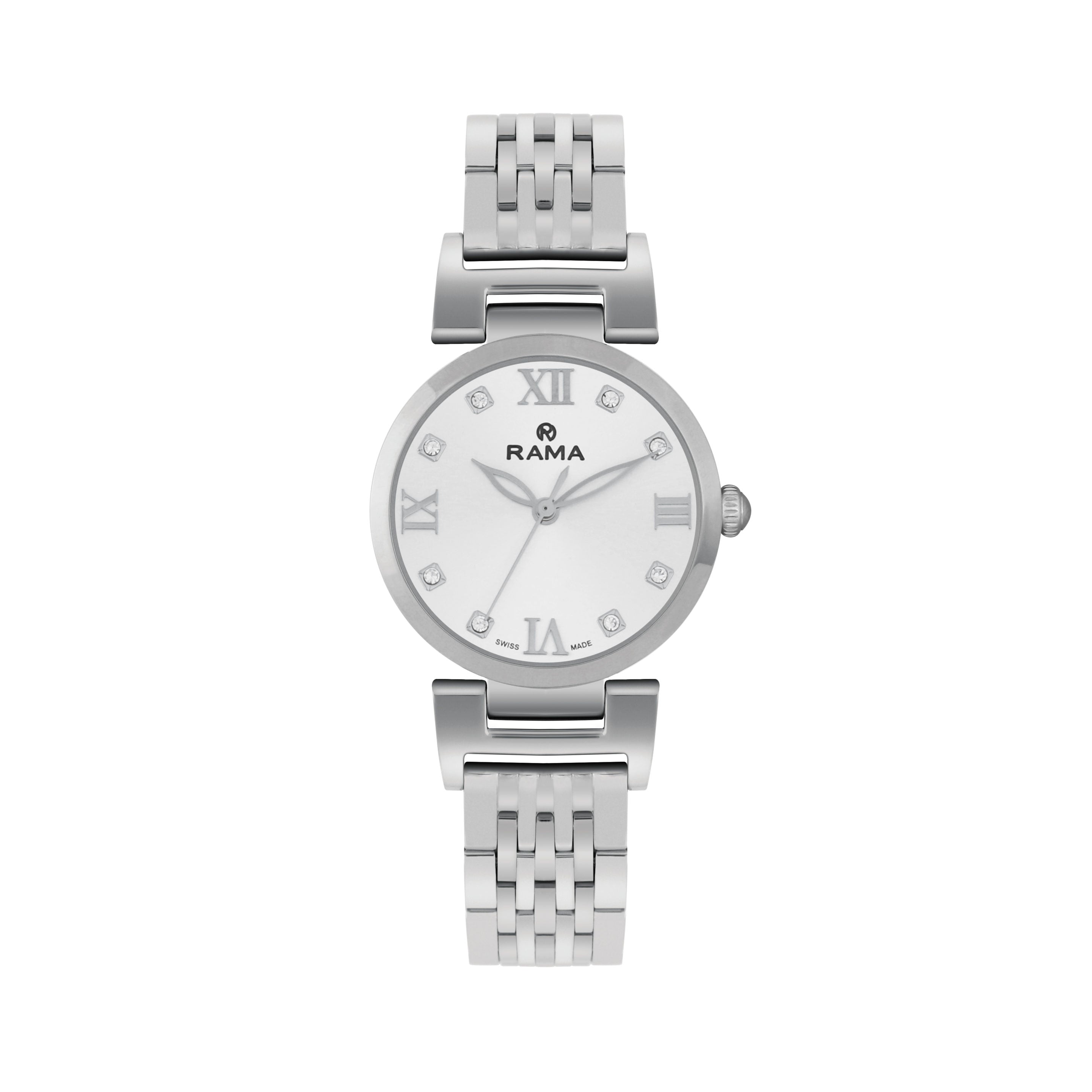 The Rama Ladies White Dial Stainless Steel Watch is an elegant timepiece that exudes sophistication and style. It features a round dial with three hands, providing precise timekeeping. The dial is white in color, creating a clean and classic look. The numbers on the dial are in roman numerals, adding to the watch's classic and timeless design. This watch is analog, meaning it has traditional watch hands to indicate the hours, minutes, and seconds. The Rama Ladies Watch is also Swiss made, guaranteeing its quality and durability. This watch is perfect for any formal or casual occasion, making it a versatile and essential accessory for any woman's wardrobe.