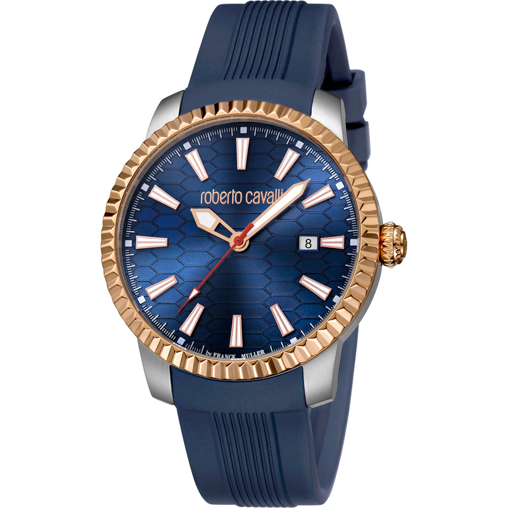 ساعة روبرتو كافالي رجالية ذات هيكل بلون ذهبي وردي، من الستانليس ستيل مع مينا زرقاء وحزام أزرق مخضر من السيلكون