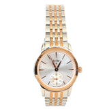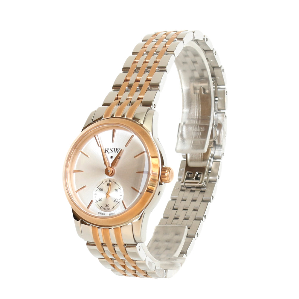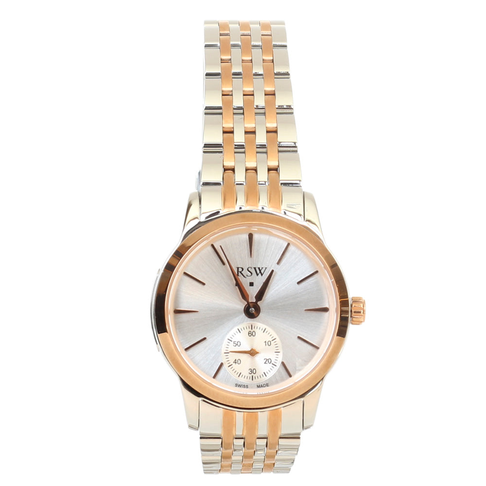 ساعة أر أس دابليو كوارتز نسائية ذات هيكل و سوار فضي و بلون ذهبي وردي، من الستانلس ستيل مع مينا بيضاء