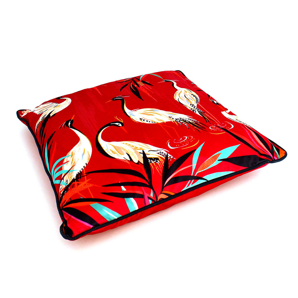 وسادة صغيرة سارة ميللر لندن هيرونز باللون الوردي الفوشيا ، تتميز بطيور غريبة وسط نباتات الخيزران الملونة في حديقة شرقية.