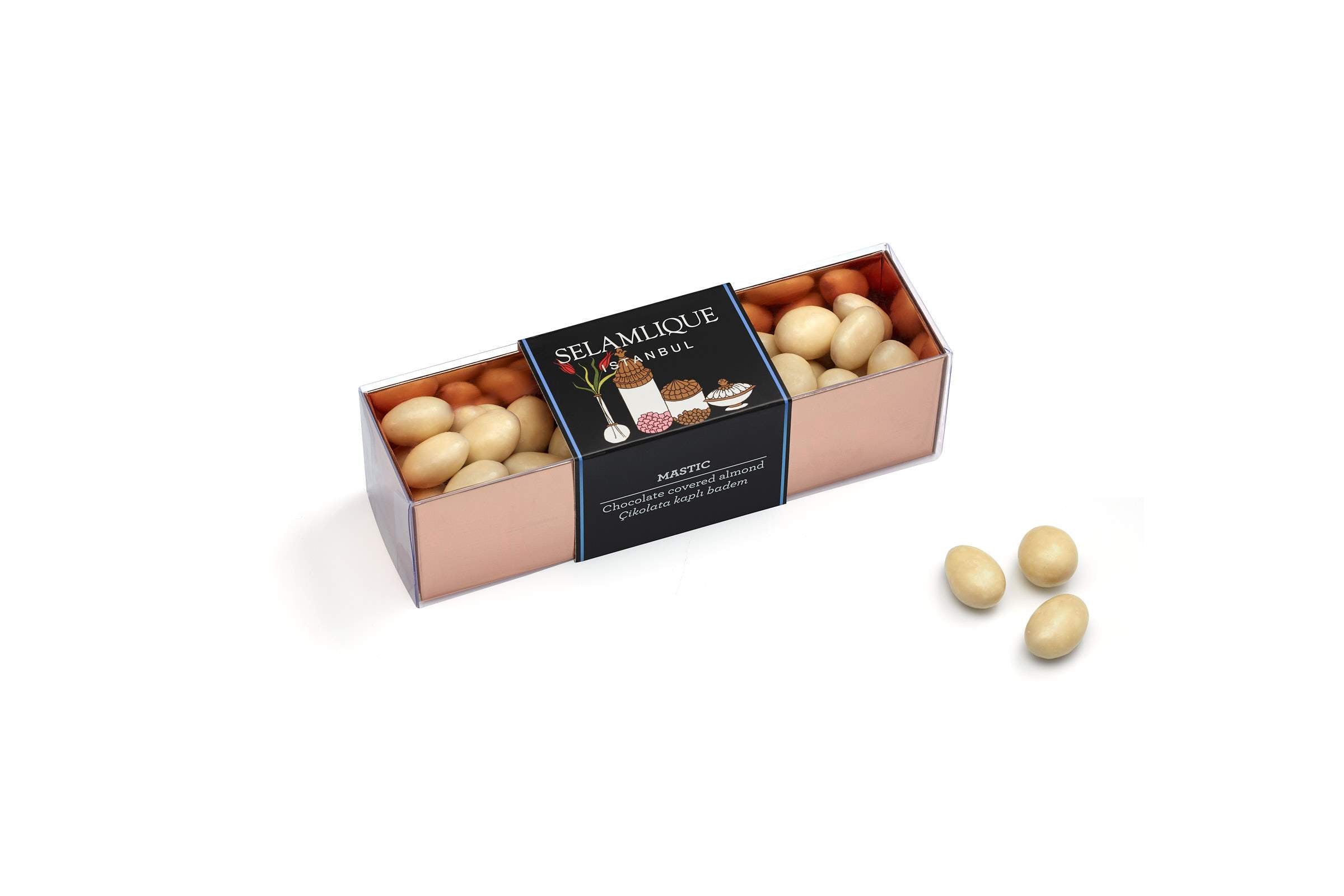 Selamlique Chocolate Almond Mastic is the perfect way to enjoy a delicious Turkish coffee break. Roasted almonds are covered with a delicately sweet combination of rose, mastic, cinnamon and Turkish coffee flavored chocolate. The crunchy almonds provide a delightful texture while the sweet flavors of the chocolate blend together to give a unique, flavorful experience. With each bite, the flavors of the rose, mastic, cinnamon and Turkish coffee awaken the senses and transport you to a traditional Turkish coffee house. Enjoy these treats as a special treat for yourself or as a gift for someone special. SPECIFICATIONS: