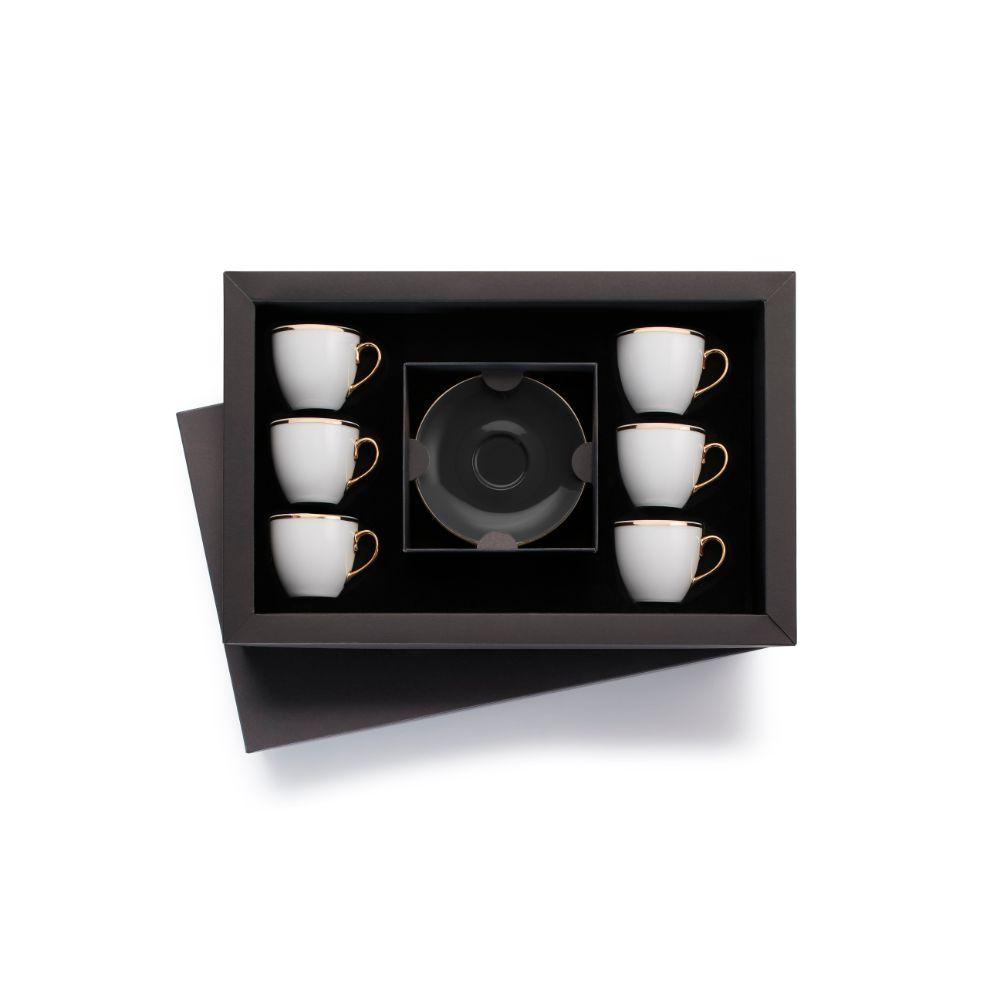 This exquisite Selamlique Set of 6 cups is perfect for savoring a Turkish-style coffee experience. This set is crafted from porcelain and consists of six cups, each with an elegant white body with gold detailing on its handle and edges. The accompanying black saucer gives the cup set an extra touch of sophistication. The design is exclusive to the Selamlique range, combining tribal influences with a contemporary aesthetic. The cup has a nice weight to it and the saucer provides the perfect finishing touch. The cup has a delicate contour and curved handle, making it comfortable to hold. The white porcelain and gold detailing create a striking impression in any kitchen. These cups are ideal for serving coffee, tea, and other hot drinks. They're also suitable for savoring a traditional Turkish-style coffee experience, where the coffee is poured from a high height. The cups come packaged in an attractive protective box so they can be stored securely for many years to come. This stunning Selamlique Set of 6 cups is perfect for elevating any coffee experience. SPECIFICATIONS
