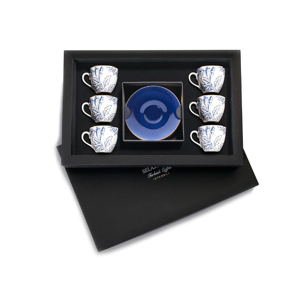 The Selamlique Set of 6 Cups Toile is the perfect gift for anyone who loves traditional Turkish-style coffee. Each cup of this exclusive design porcelain set is crafted with exquisite style and durability in mind, making it an ideal addition to any home. The cups feature a modern floral pattern. The set includes cups and saucers, all presented in a sleek black gift box. This perfect mix of tradition and modernity makes for a great conversation starter. The vibrant colors and intricate pattern will stand out wherever they are placed. The porcelain material ensures a long lasting finish that won’t chip or fade, so there’s no need to worry about regular maintenance or upkeep. Set aside some time for an afternoon pick-me-up and enjoy Turkish coffee like a true Ottoman. The Selamlique Set of 6 Cups Toile is the perfect companion for an at-home coffee break. SPECIFICATIONS