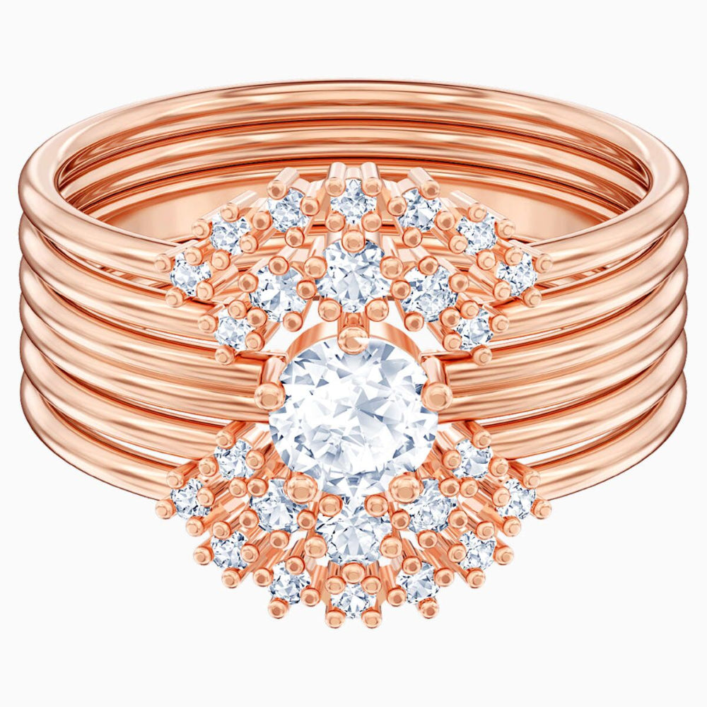 مطلي بالذهب الوردي ، هذا الخاتم المكون من ستة أحجار مرصع بمجموعات من بلورات بيضاء رفيعة الشكل ، متلألئة مثل النجوم ، ويتميز بقطعة مركزية كبيرة من الكريستال.