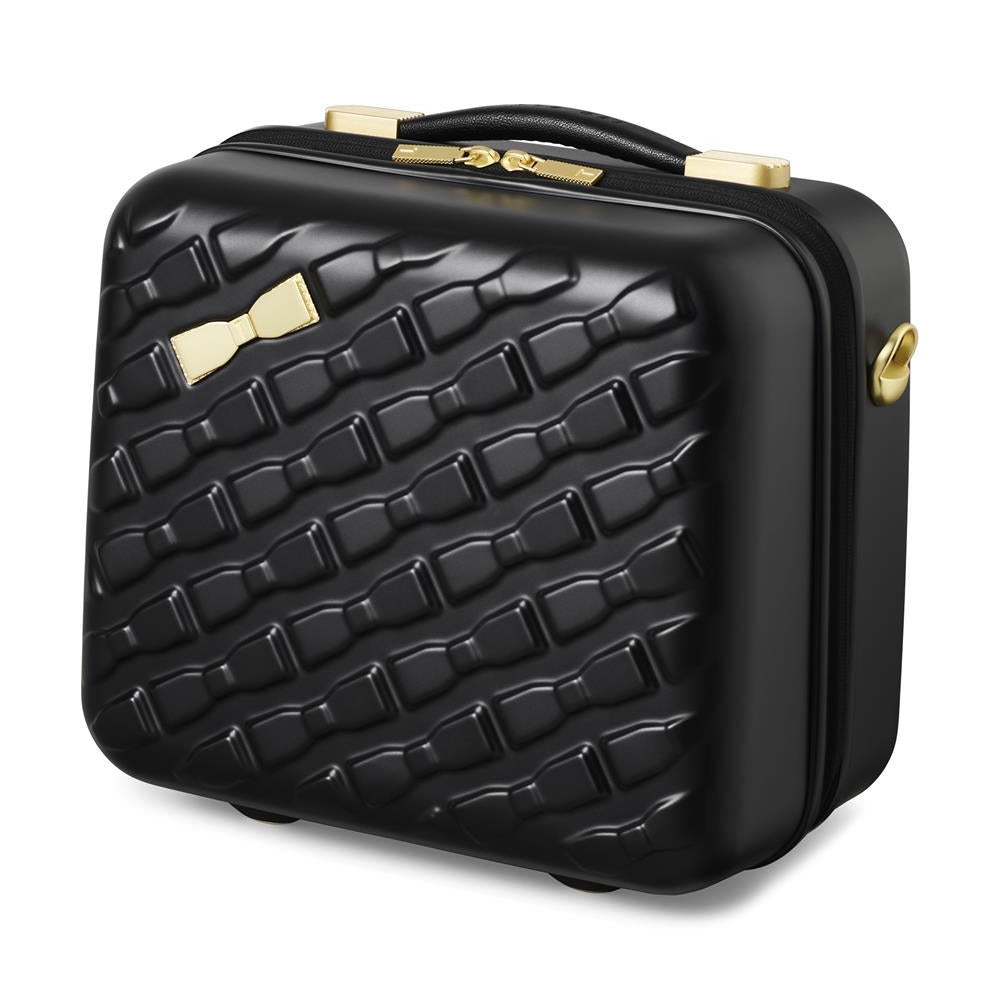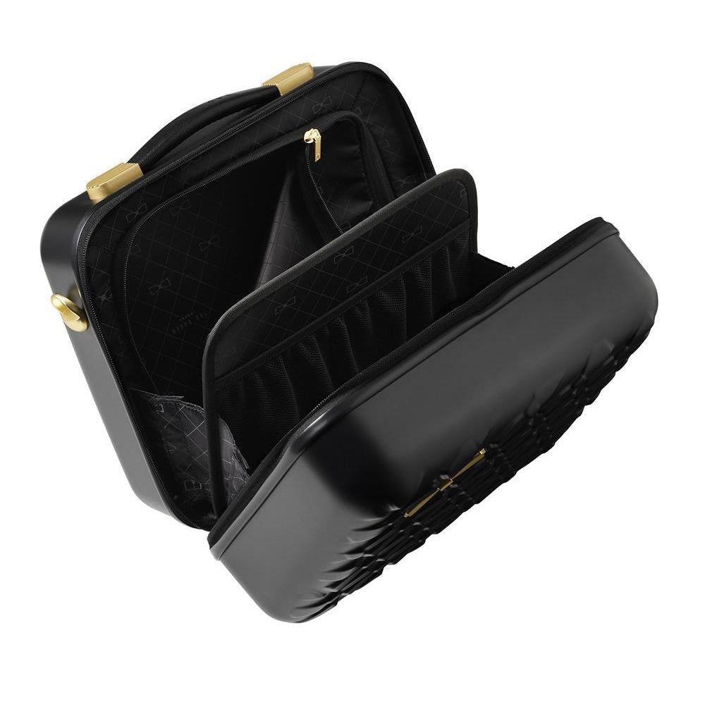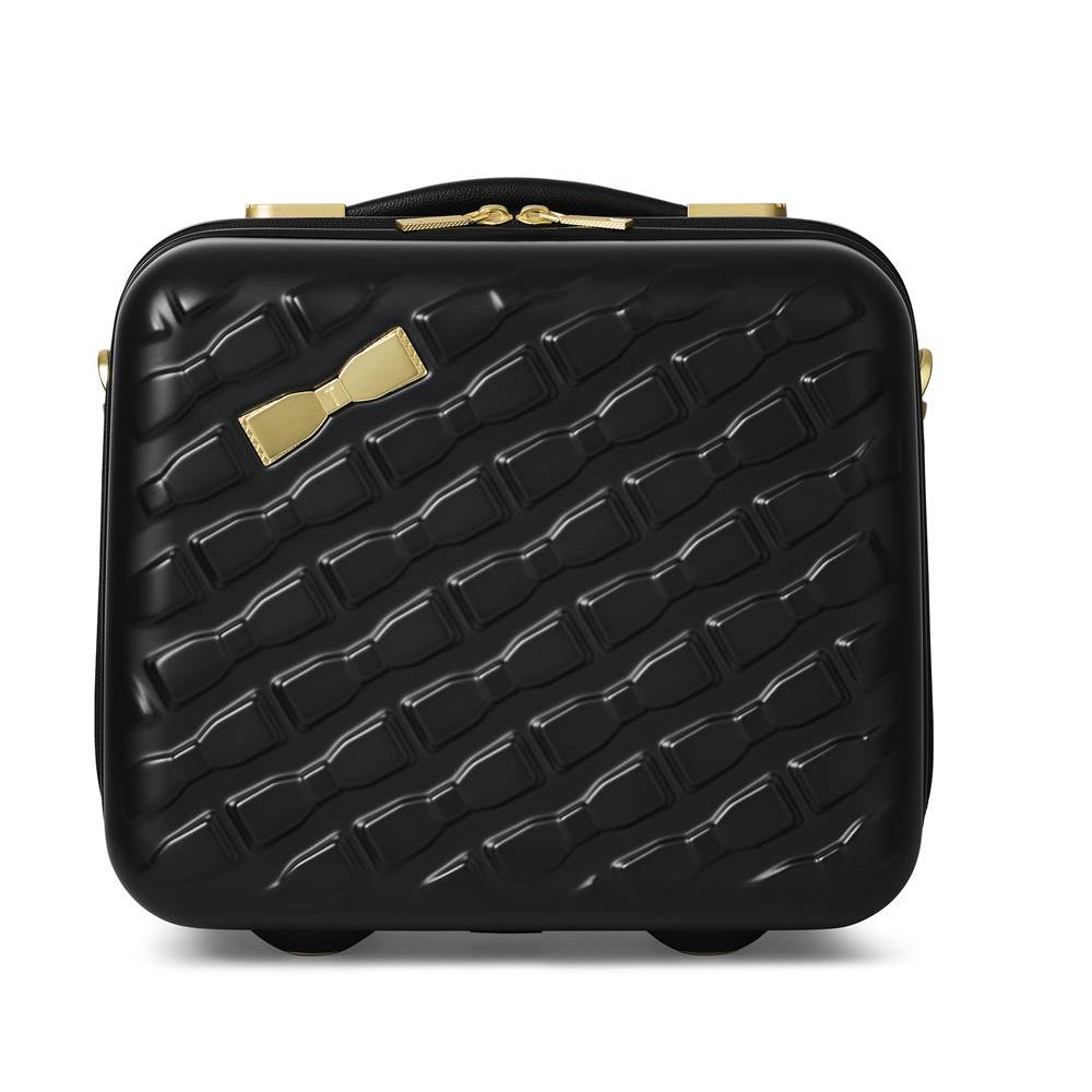 The Ted Baker Belle Cosmetic Case Vanity Black is the perfect travel companion for all makeup, beauty, and skincare essentials! With its signature embossed bow texture and iconic Black design, this luggage piece exudes luxury and femininity. It's hard shell construction ensures contents are kept safe and secure, with a zip fastening to provide maximum protection throughout your travels. The top handle and adjustable shoulder strap provide optimum comfort, while the addition of a convenient trolley strap allows you to attach the cosmetic case to your larger suitcases with ease. Inside, a host of internal compartments, zipped pockets, and elasticated slots provide endless organization, making sure you never have to leave any of those beauty favorites behind. Perfectly sized for a weekend getaway, the Ted Baker Belle Cosmetic Case Vanity Black is the stylish yet practical choice for all of your travels. SPECIFICATIONS: