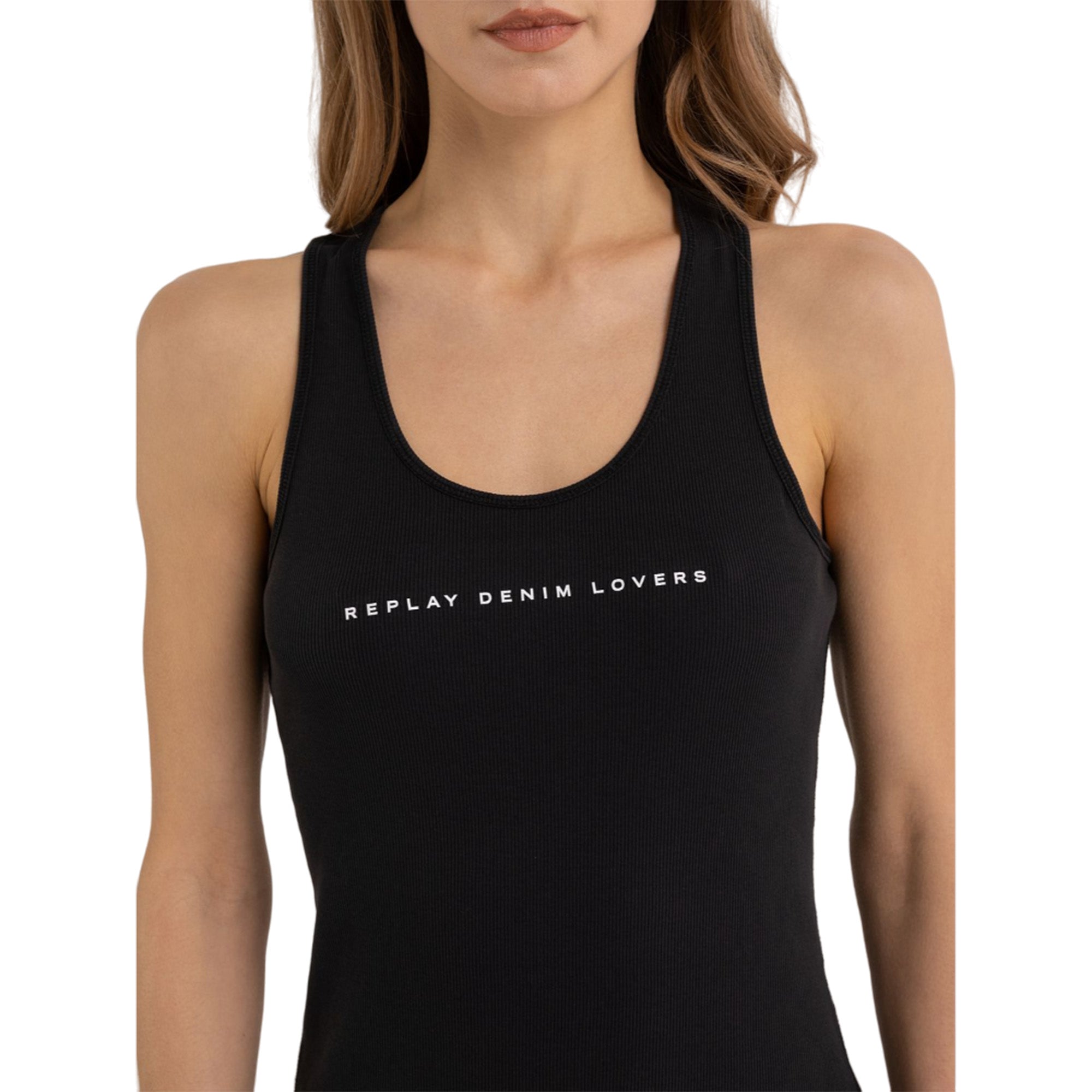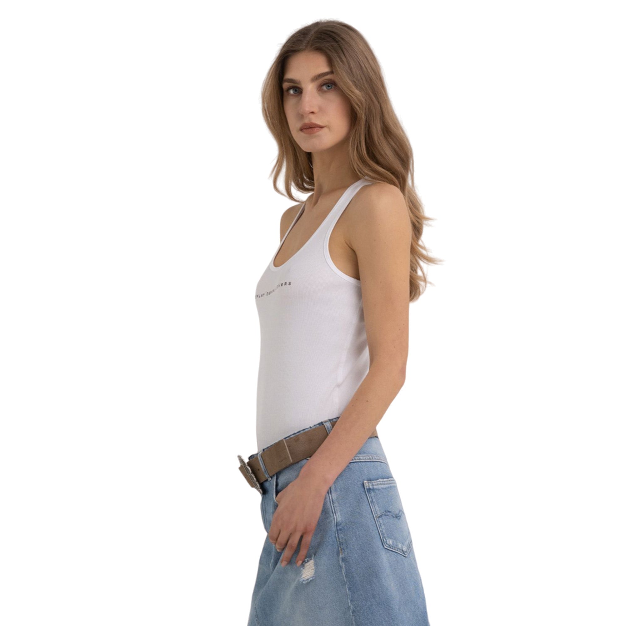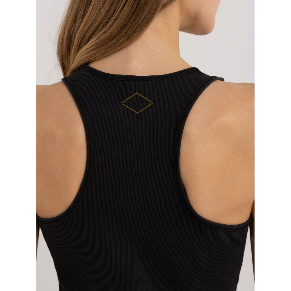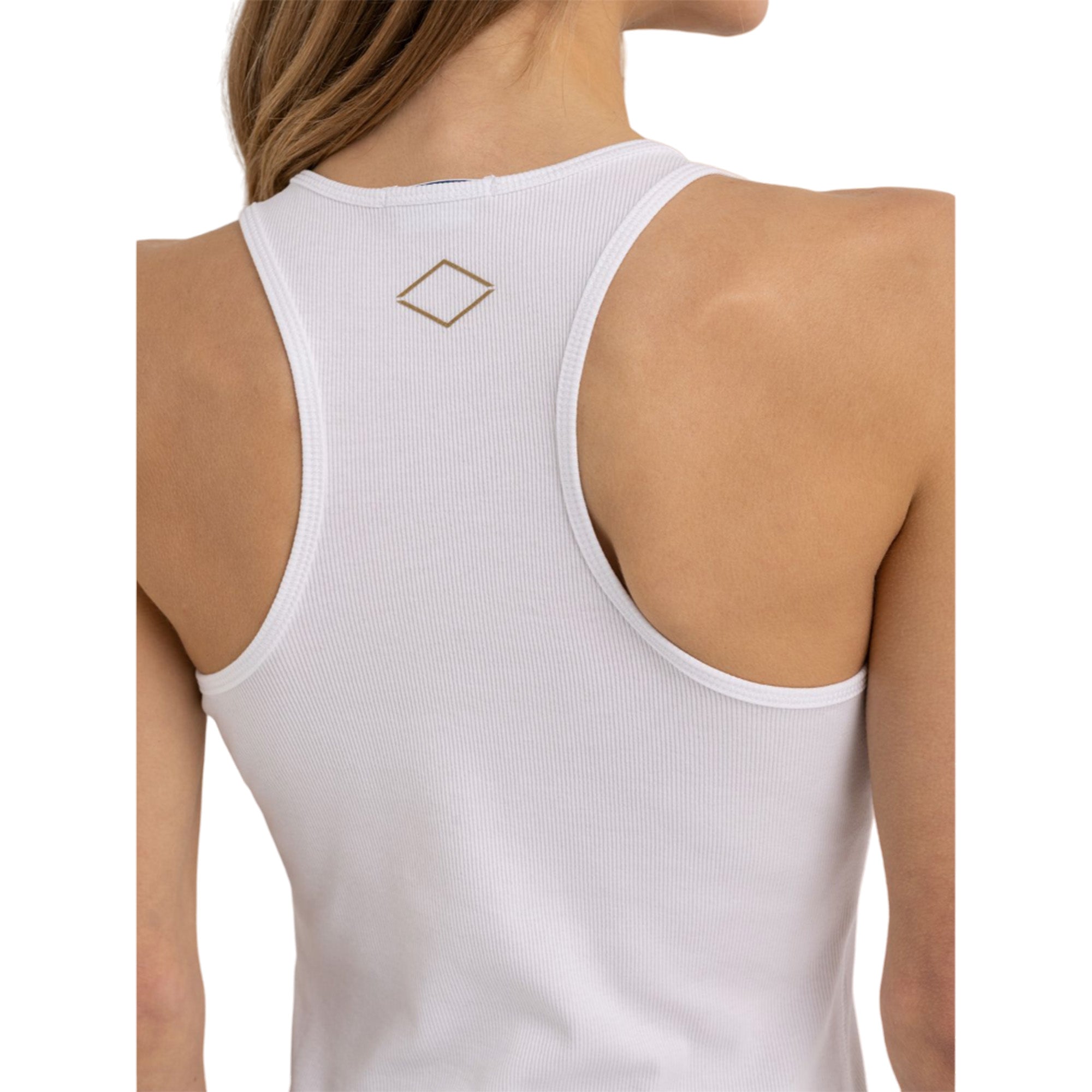Crewneck top made of ribbed stretch cotton. The racerback garment features a tight fit. The item is enhanced by the customized print at the front.