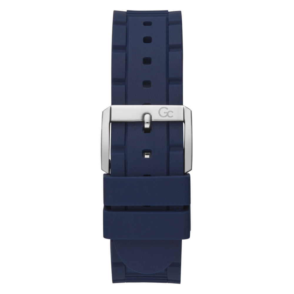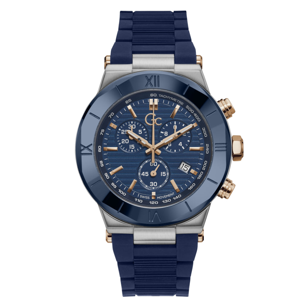 The Gc Force Sport Chic Collection Gents Watch is both stylish and functional. This watch features a signature silver and blue textured stainless steel case that is a sleek and modern design. The watch features a blue textured silicone band with a regular buckle making it adjustable to fit any wrist size. The watch has a Swiss Movement - MIF - Quartz Chronograph movement and a case diameter of 44.0mm. It has a water resistance rating of 100 meters, making it suitable for swimming and snorkeling. The Gc Force Sport Chic Collection Gents Watch is stylish and reliable, perfect for any sports or outdoor enthusiast.
