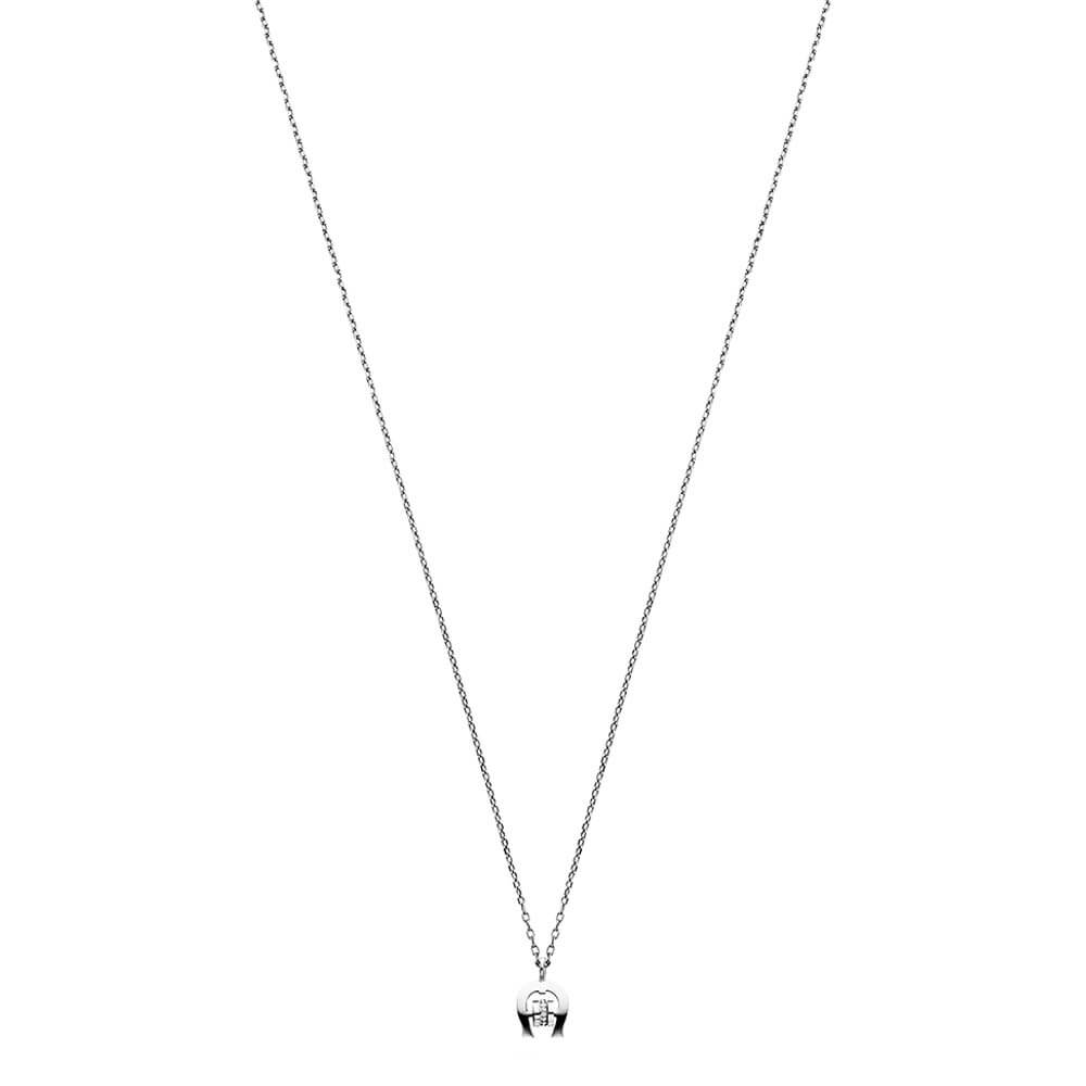 The necklace consists of a fine, silver-toned chain made from durable stainless steel. The pendant is a small, polished version of Aigner's signature horseshoe "A" logo. A single, clear crystal is set at the base of the "A," adding a subtle touch of sparkle that catches the light. The pendant is attached directly to the chain, giving the piece a streamlined and modern look. The necklace has an adjustable length, making it versatile for different necklines and styles. This piece is perfect for everyday wear and can be easily layered with other necklaces for a more personalized look.