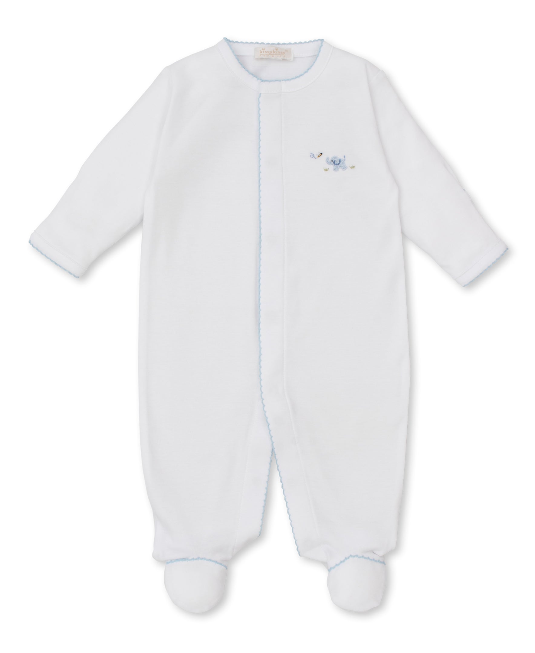 The Kissy Kissy Kids New Born Boy’s White Sleepsuit Set is a classic and cozy outfit crafted from 100% Pima cotton, renowned for its exceptional softness and gentle touch on delicate newborn skin. This charming sleepsuit features a crew neck and covered feet to keep your baby warm and comfortable throughout the day and night. Adorned with a delicate hand-embroidered elephant, it adds a sweet and timeless detail to the simple design. Practical front fastening runs from the neck to the leg, making dressing and diaper changes quick and effortless. This sleepsuit combines comfort, functionality, and elegance, making it a perfect addition to your baby boy’s wardrobe.