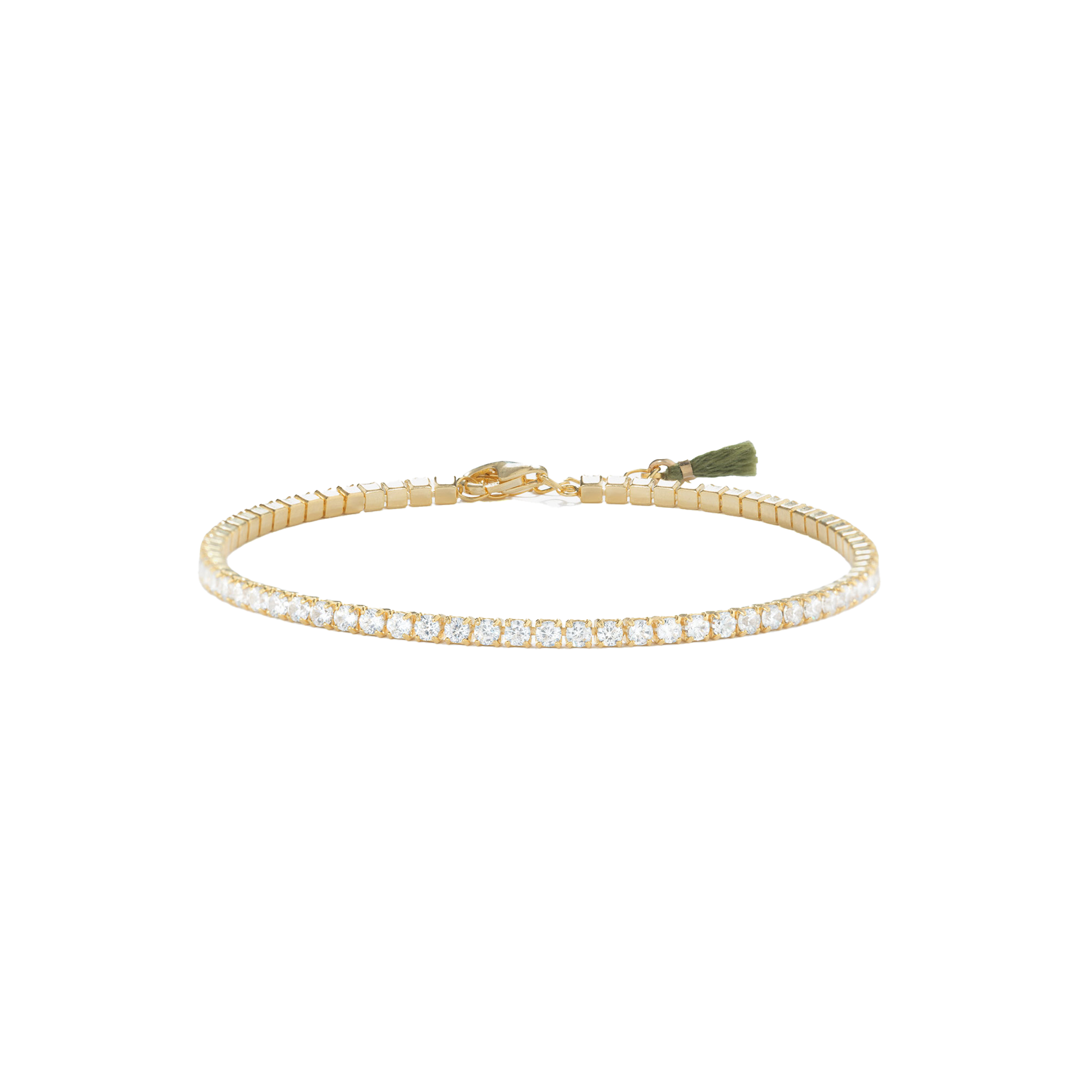 Classic elegance meets modern versatility. The Shashi Tennis Bracelet in Gold adds a refined sparkle to any wrist. Crafted from 18K gold-plated brass, it features a single row of brilliant cubic zirconia stones that radiate timeless glamour. The flexible design ensures a comfortable fit, while the signature Shashi tassel detail adds a subtle, contemporary charm. Perfect for both everyday wear and evening sophistication.