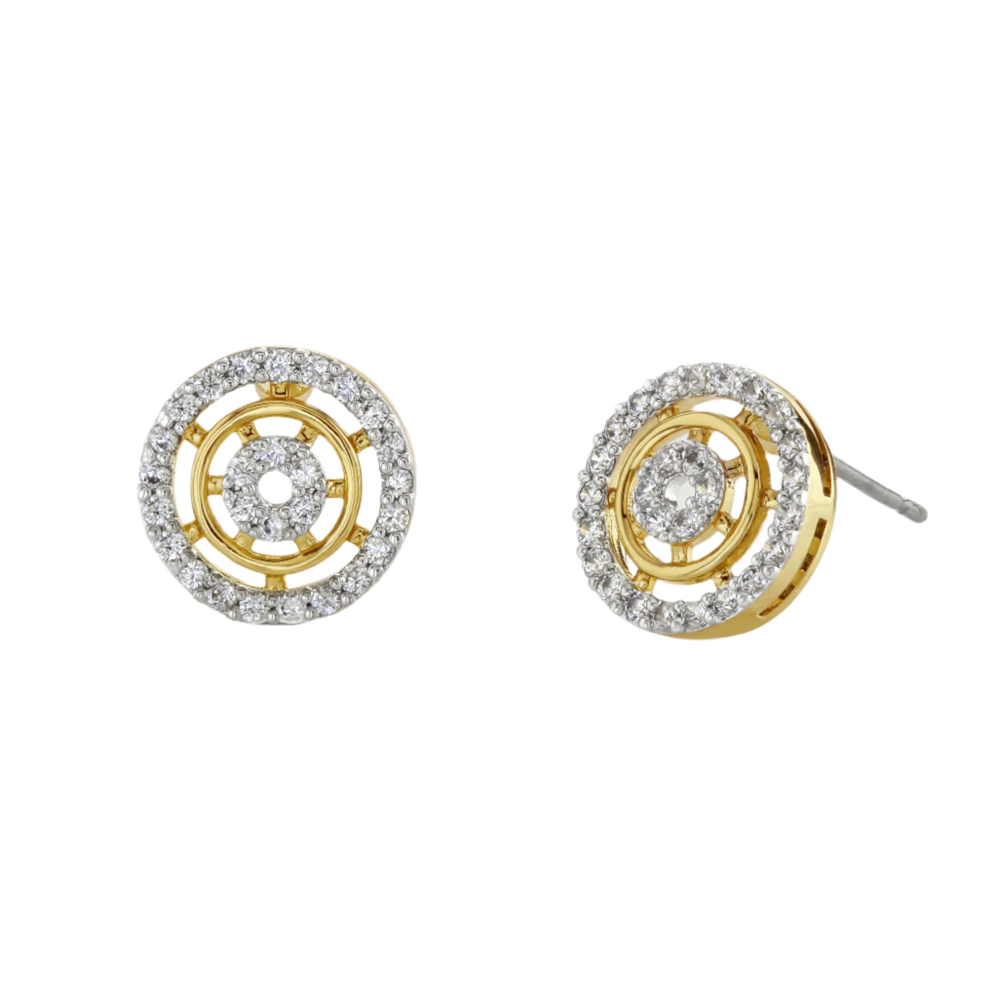 The Buckley London Two Tone Pave Halo Stud Earrings in Gold and Rhodium are a striking expression of sophisticated elegance. These exquisite studs feature a mesmerizing wheel design, where dual-tone pave cubic zirconia stones create a dazzling surround, gracefully encasing a radiant gold wheel at the center. The core of each earring is beautifully adorned with a cubic zirconia halo, reminiscent of a delicate doughnut, adding extra brilliance and dimension. Perfect for both everyday luxury and special occasions, these earrings effortlessly blend gold and rhodium tones with shimmering stones, making them a radiant addition to any jewelry collection.
