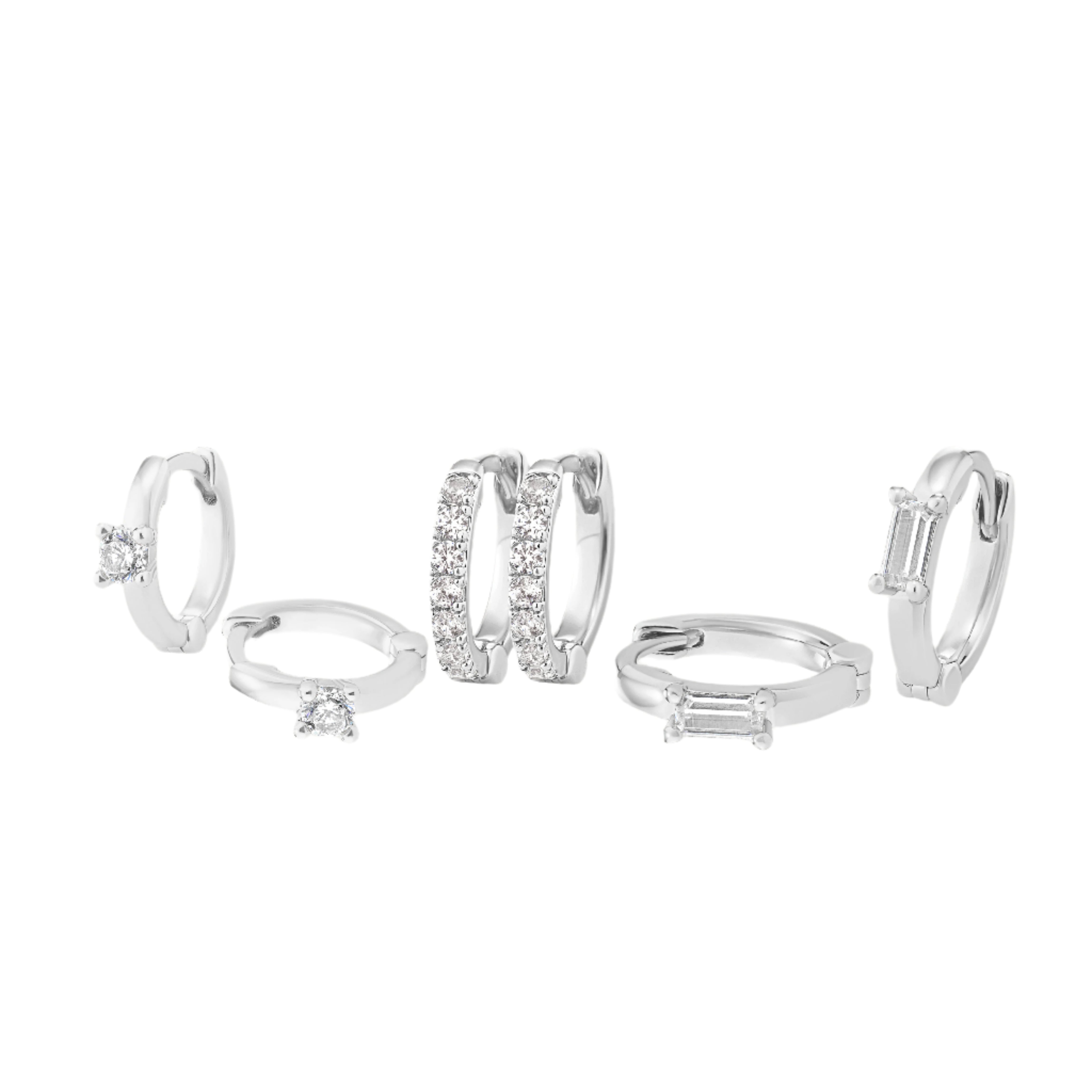 • Set of 3 crystal huggie earrings in imitation rhodium plate