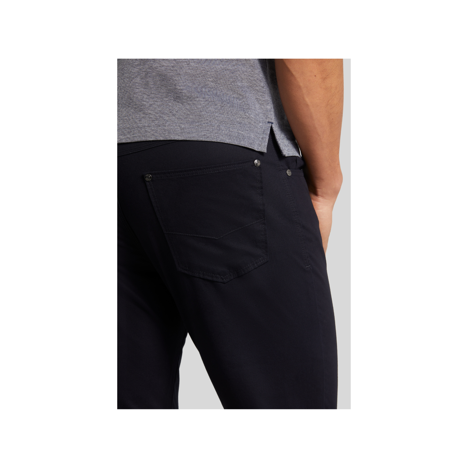The Bugatti Men's Navy Trouser is a classic and versatile wardrobe essential, designed to combine timeless style with functional features. Crafted in a comfortable regular fit, these trousers provide a relaxed yet tailored silhouette suitable for various occasions. The traditional five-pocket design offers practicality and convenience, while the six belt loops allow for easy accessorizing with a belt to enhance the overall look. Featuring a durable button and zip closure, the trousers ensure a secure and comfortable fit. Additionally, the true-to-color effect guarantees that the rich navy hue remains vibrant and fade-resistant even after repeated wear, making the Bugatti Men's Navy Trouser a reliable and stylish choice for any wardrobe.