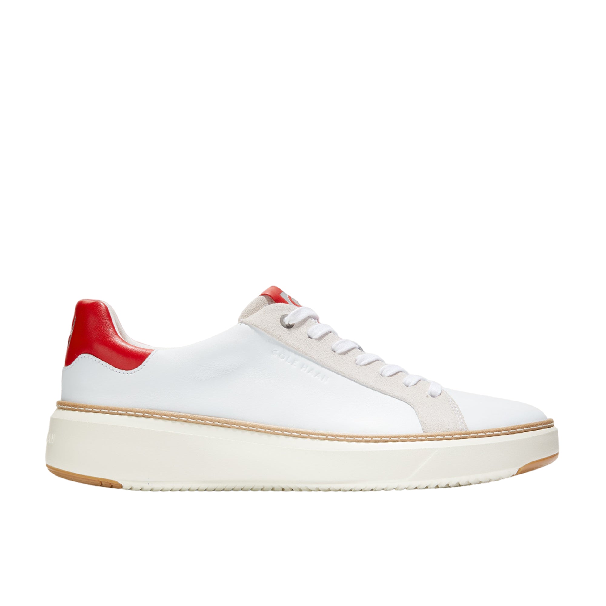 | The GrandPr Topspin Sneaker by Cole Haan features a crafted welt that connects an extra-cushioned GRANDFAM midsole to a luxurious leather upper. It also changed the construction, so this lightweight and flexible sneaker has an anatomical sockliner and padding in the heel for exceptional fit and comfort in any arena. SPECIFICATIONS :