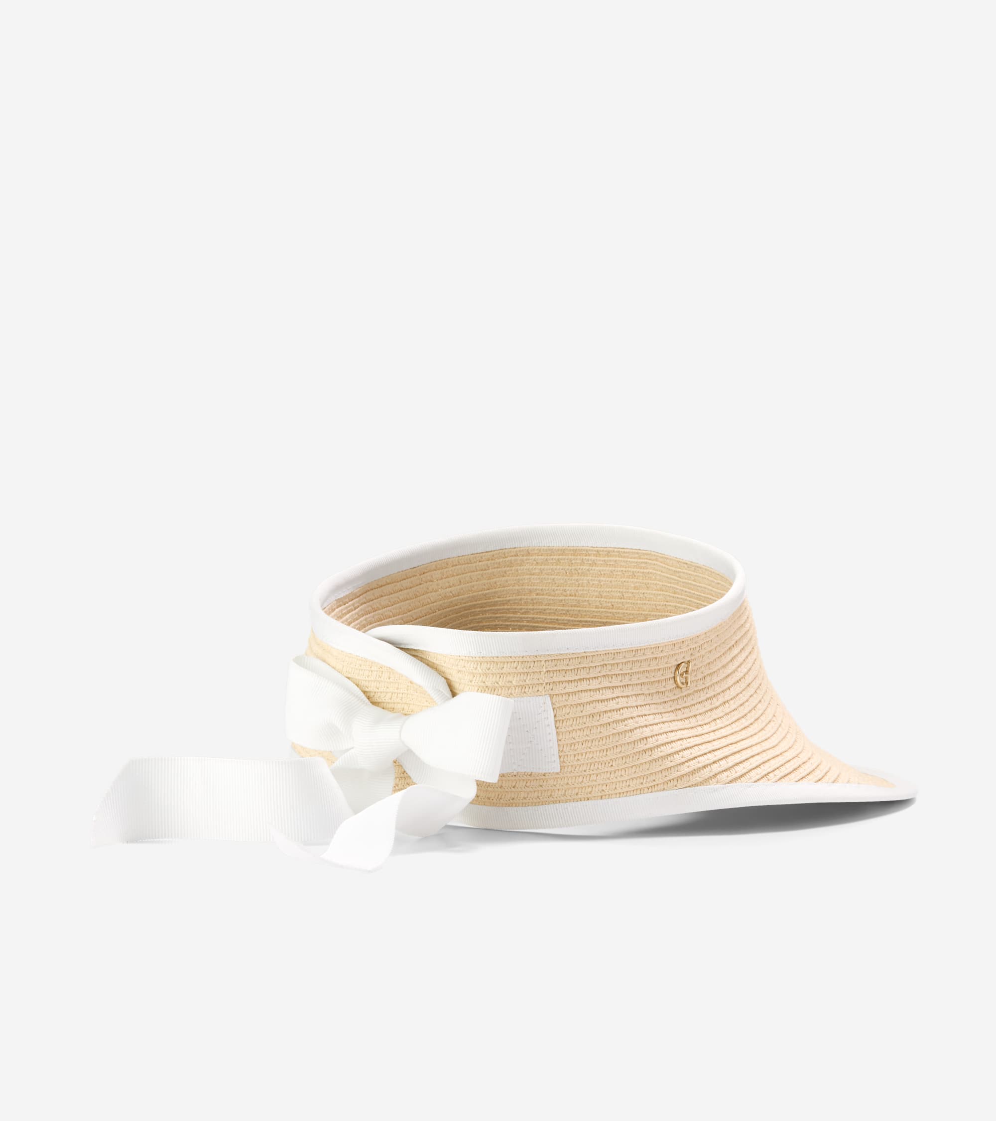 - Straw in Natural with grosgrain trim; metal logo plate; Velcro closure