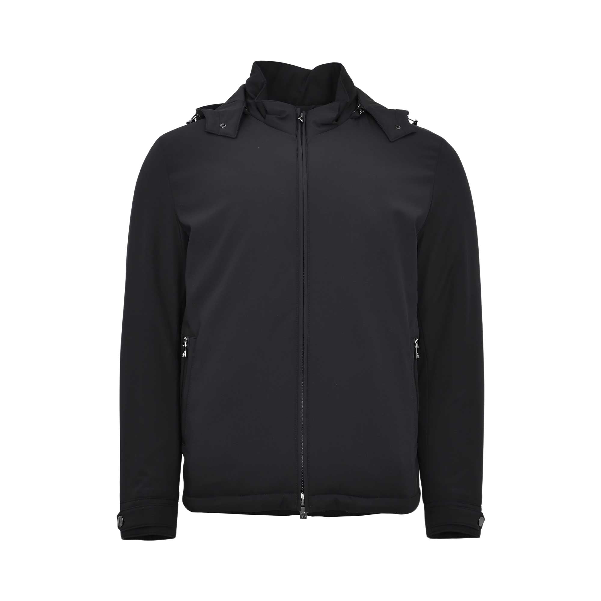 Color & Material: The jacket is a deep, solid black or dark navy blue. It is likely made from a smooth, water-resistant technical fabric, with the main body appearing slightly different from the sleeves, suggesting a possible stretch or contrast paneling.
