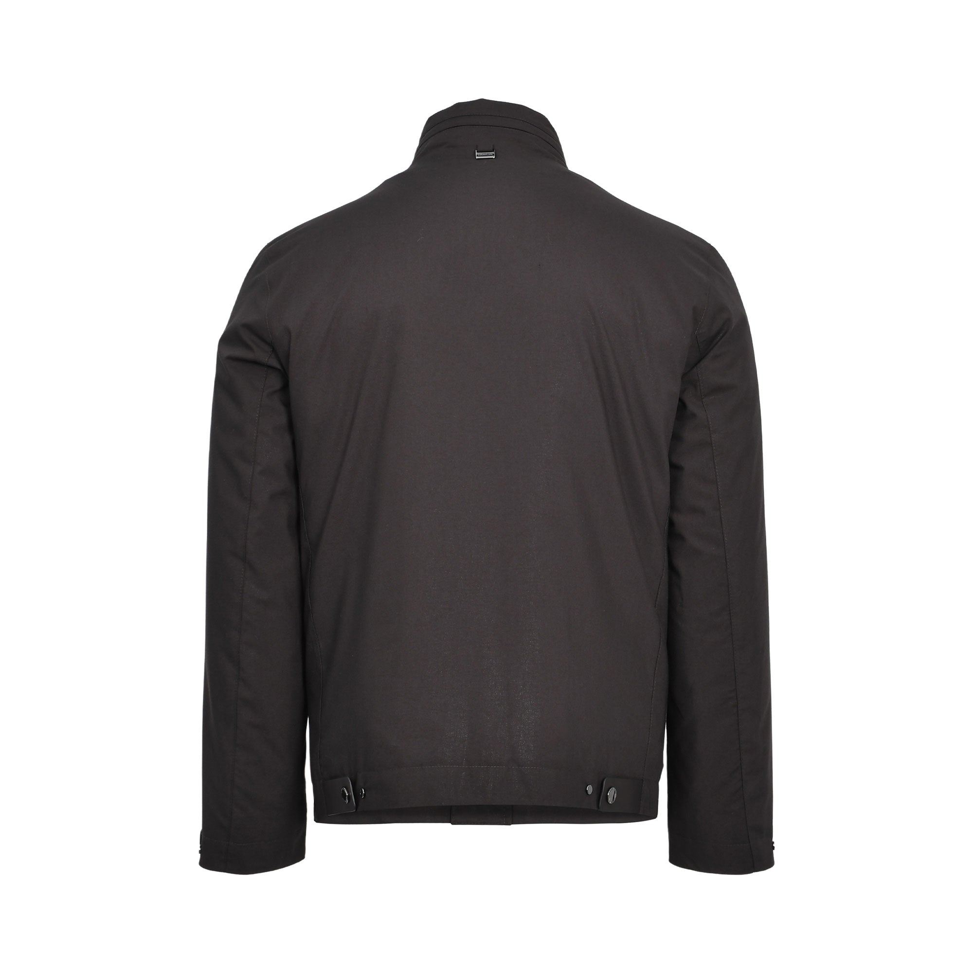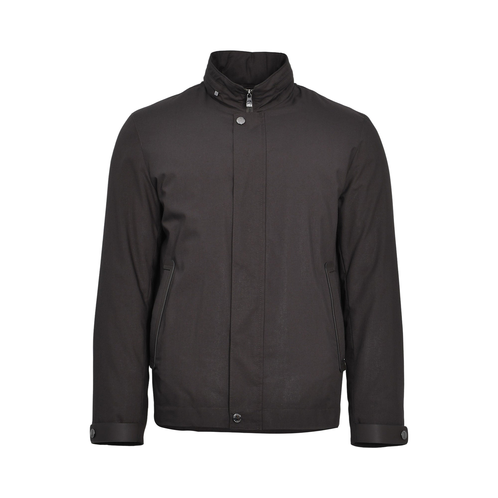 • Color & Material: The jacket is a solid, deep dark brown, black, or dark charcoal grey. It is likely crafted from a smooth, technical, or water-resistant fabric.