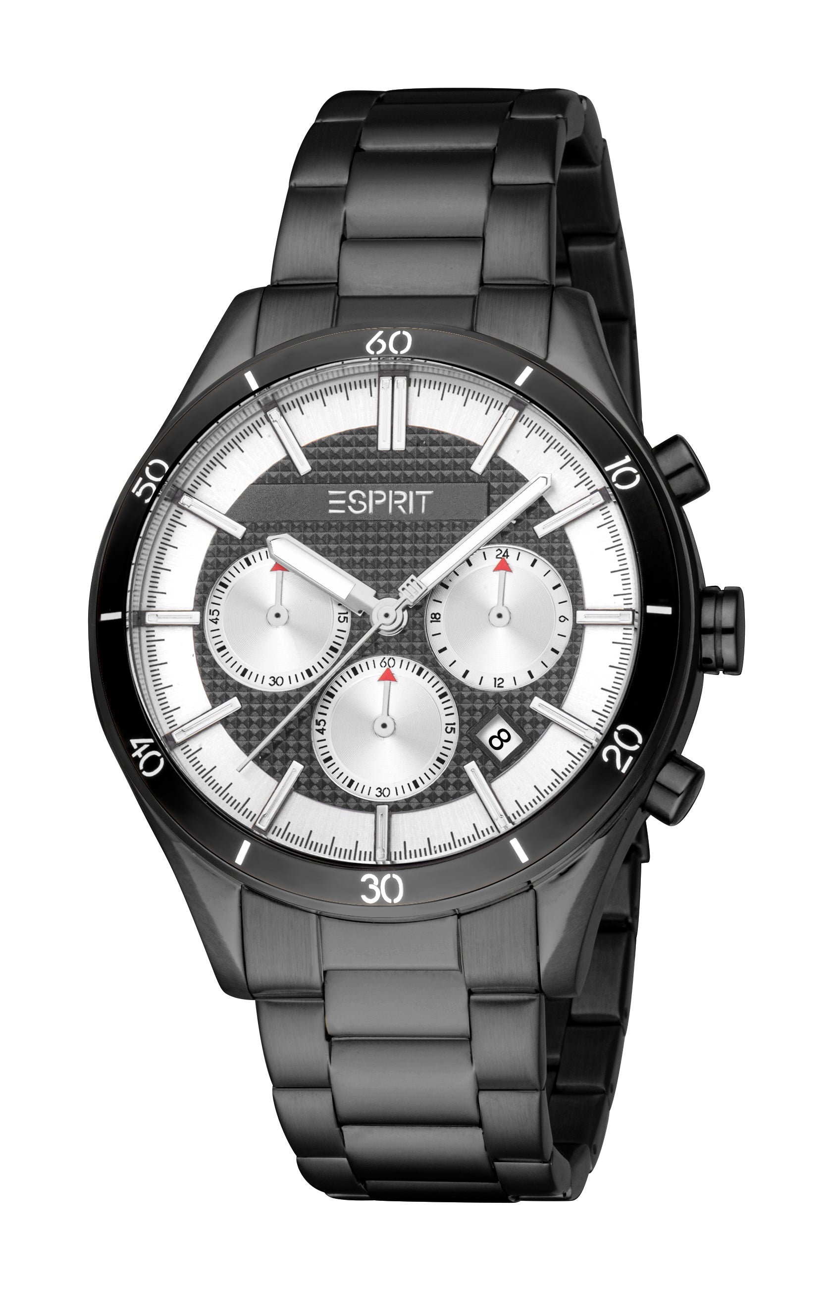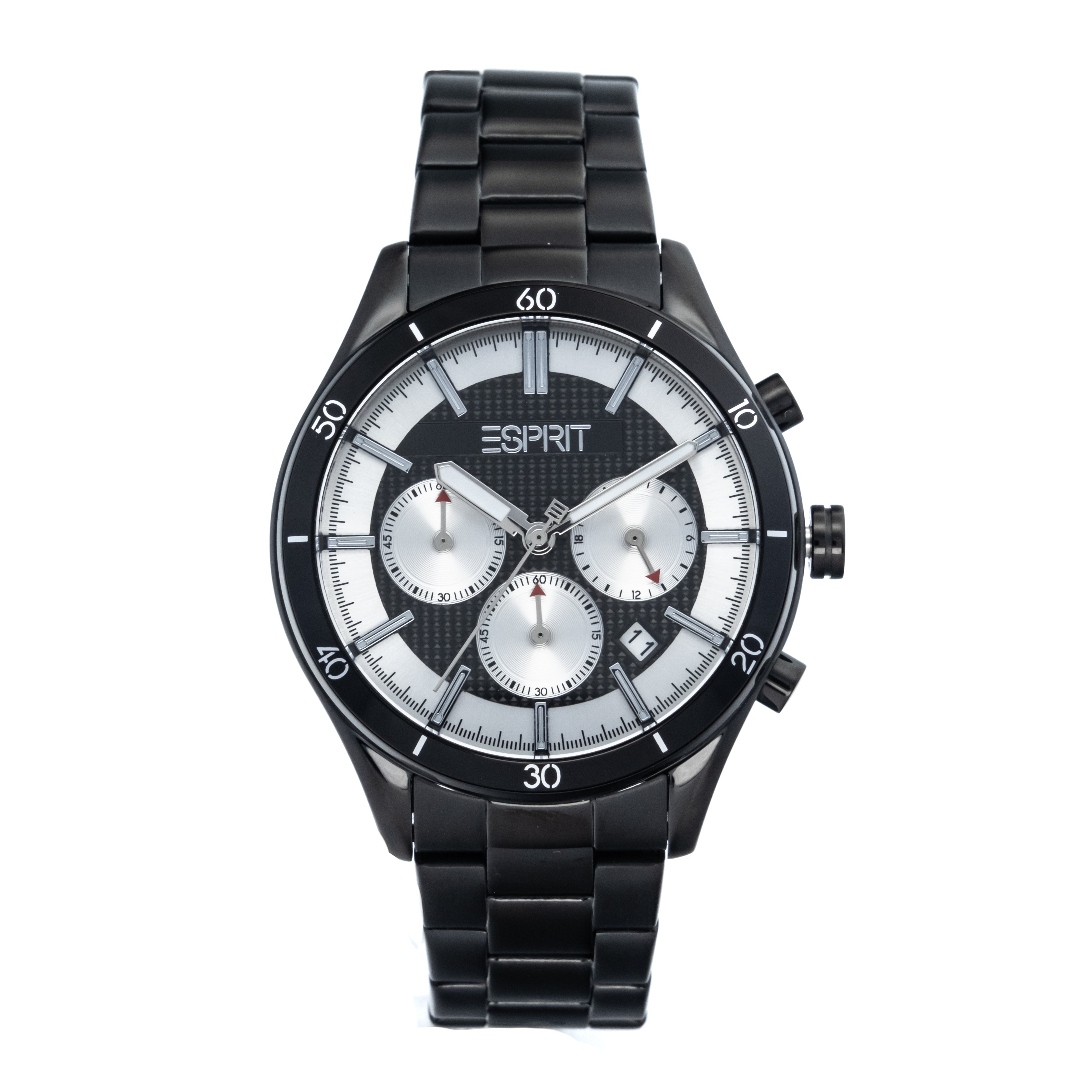 Make a bold statement with this Esprit chronograph watch, designed with a sleek black stainless steel bracelet and a dynamic dual-tone dial. The black textured center contrasts elegantly with the silver sub-dials and outer ring, offering a modern, sporty aesthetic. Featuring a stopwatch function, date display, and luminous hands for enhanced readability, this watch combines fashion and function for everyday wear or special occasions.