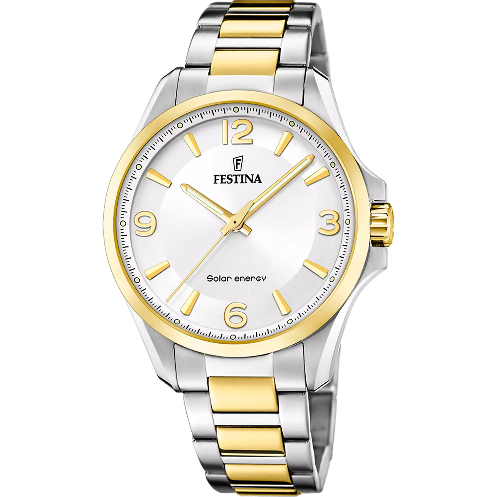 Embrace sustainability and style with the Festina F20657/1 men's solar-powered watch. This elegant timepiece features a classic white dial complemented by a sophisticated silver-tone and gold-tone bracelet, making it a versatile choice for any occasion.