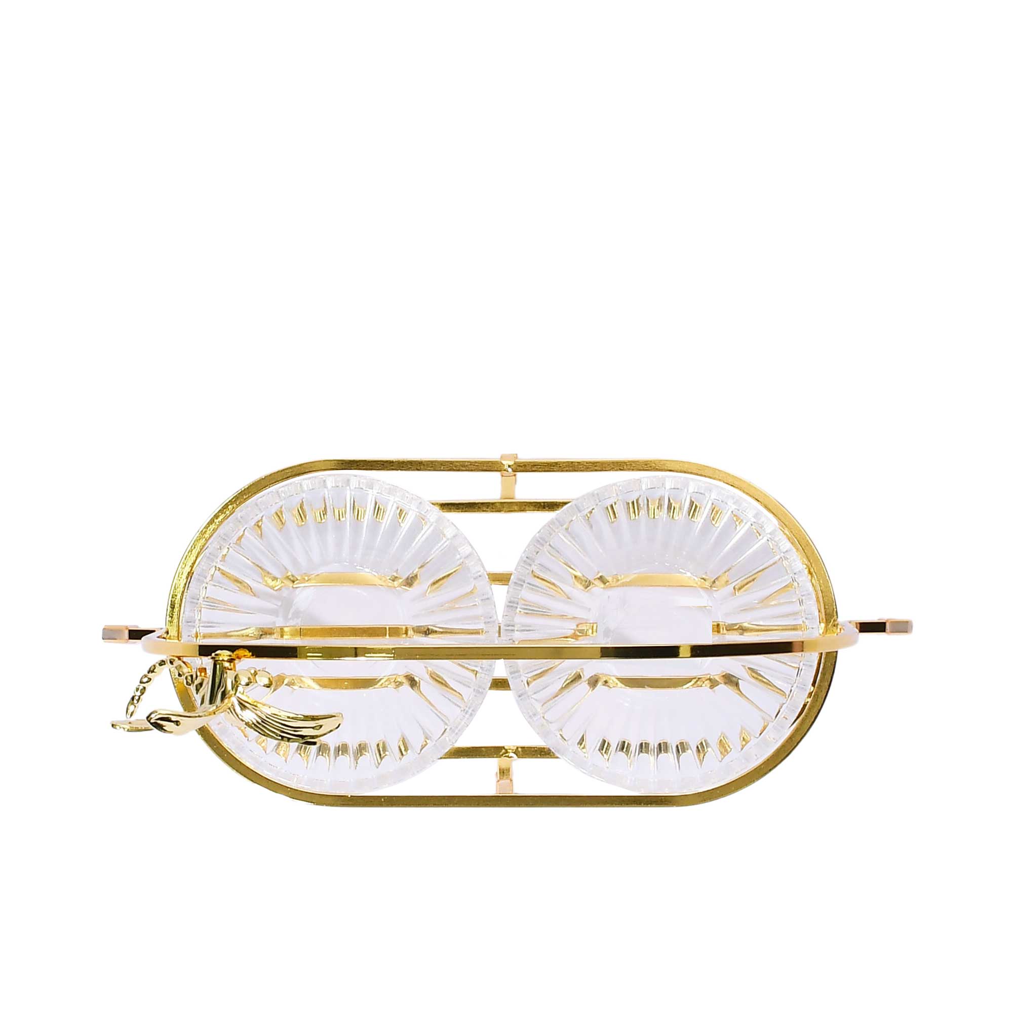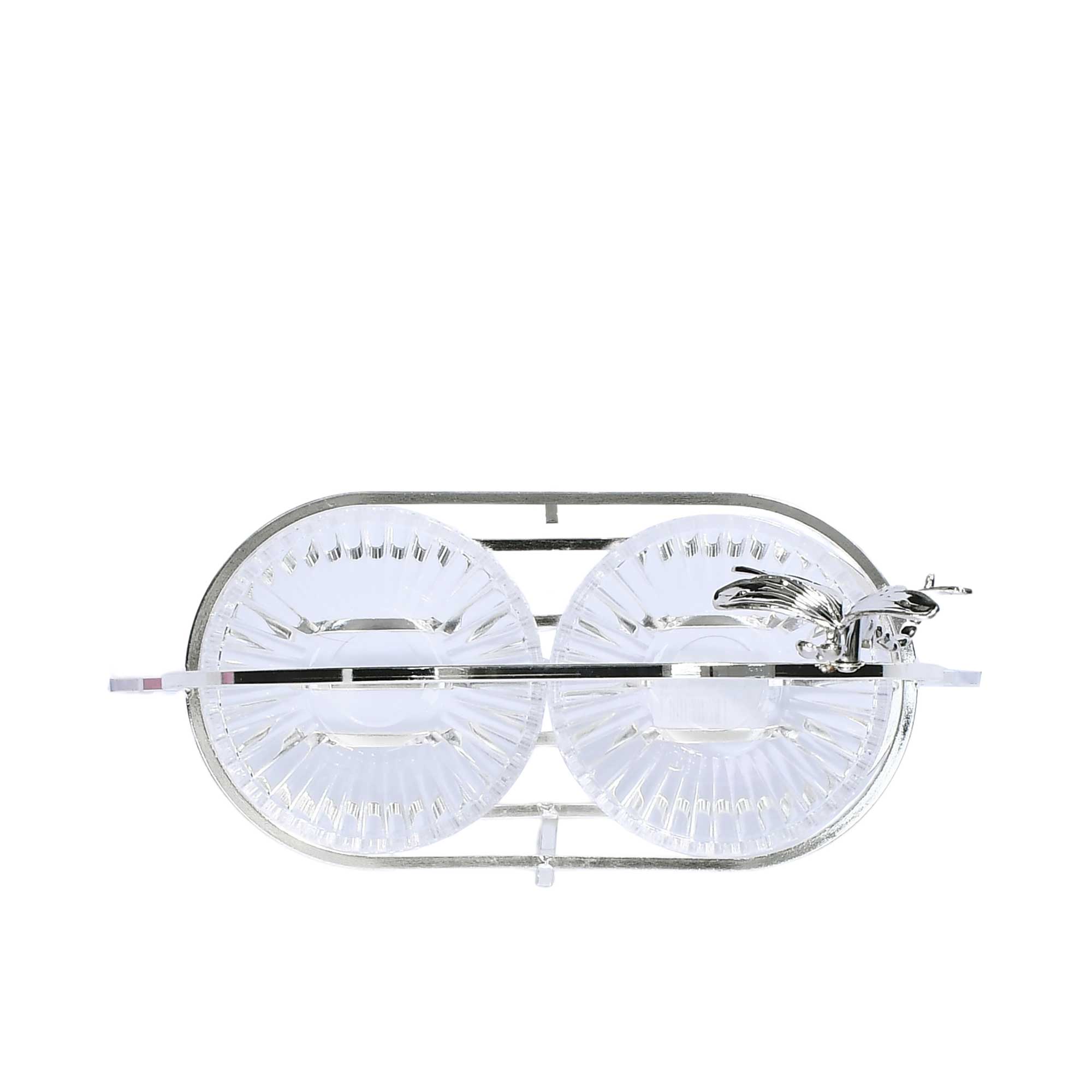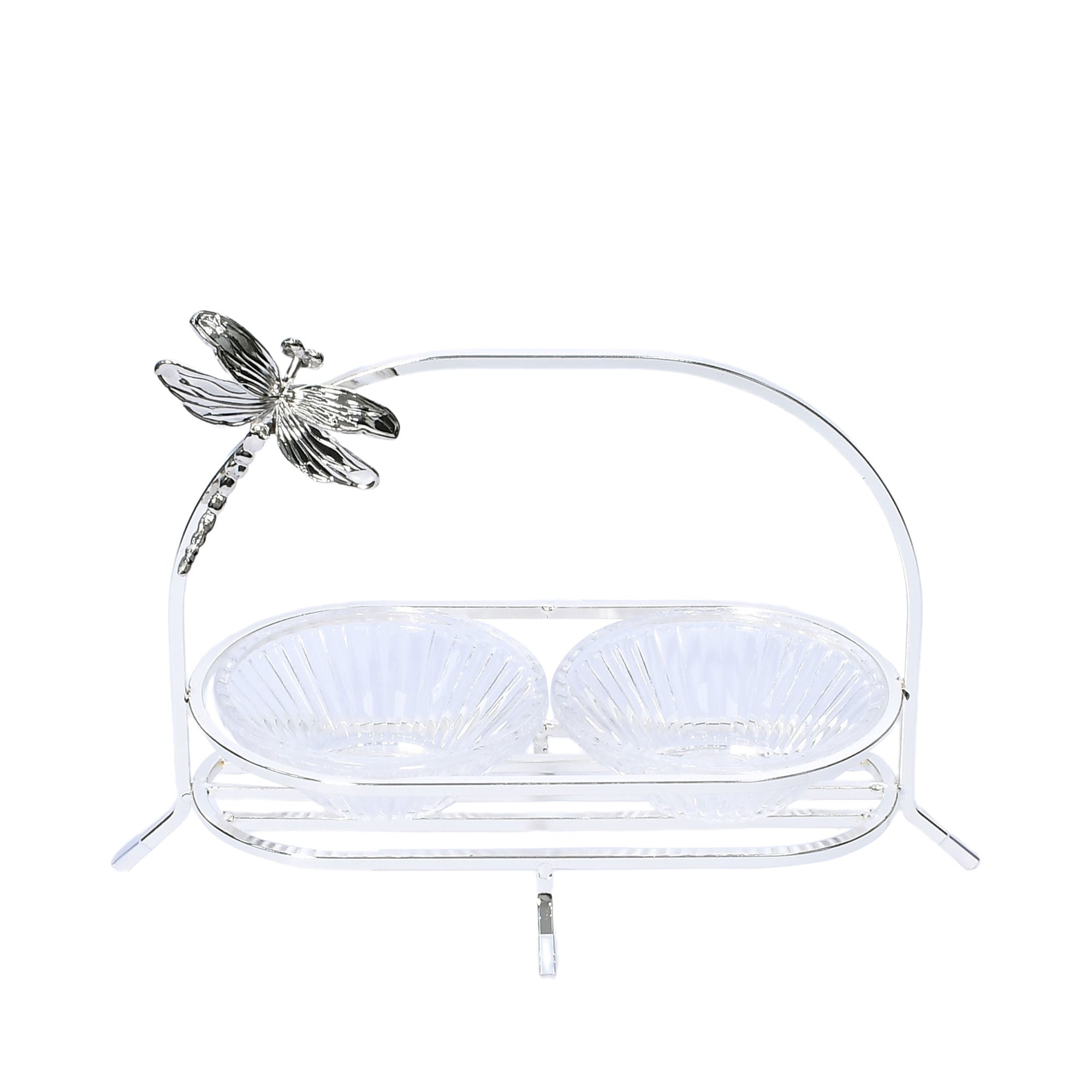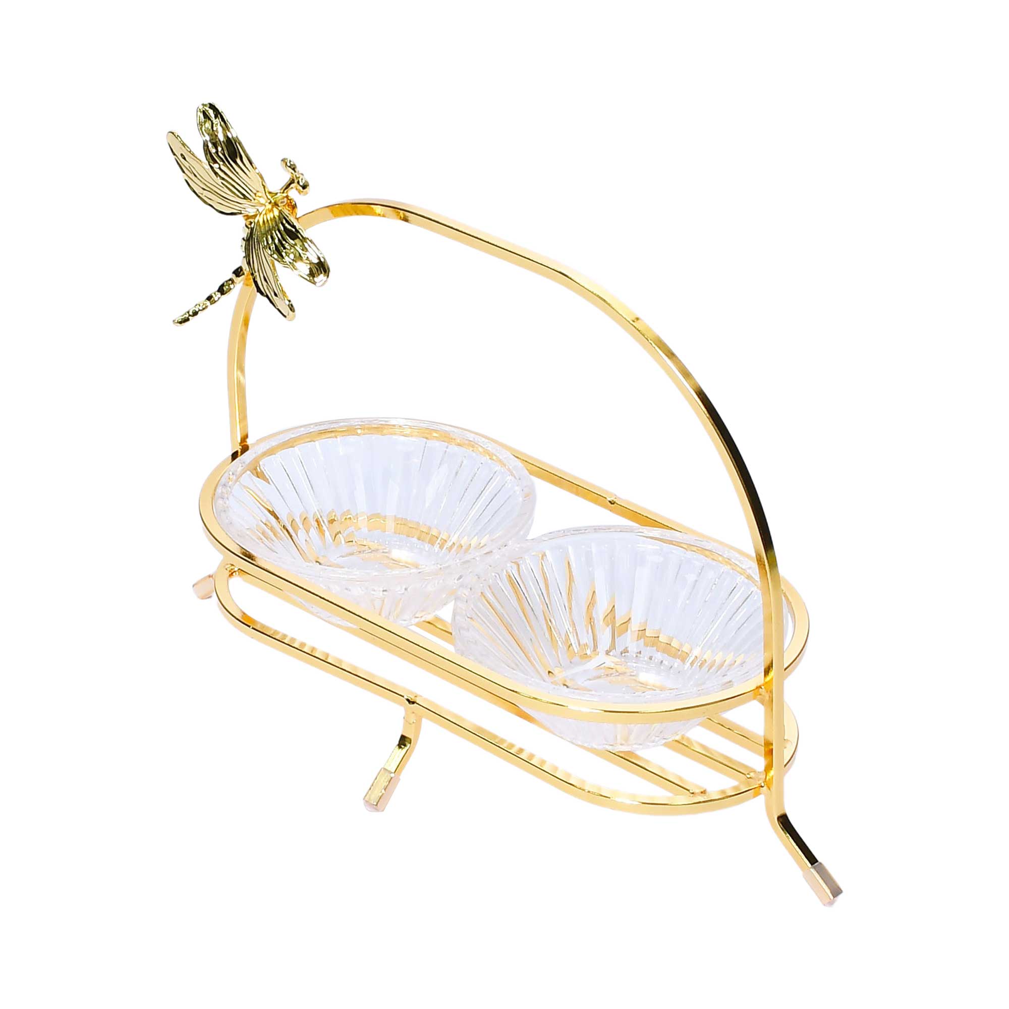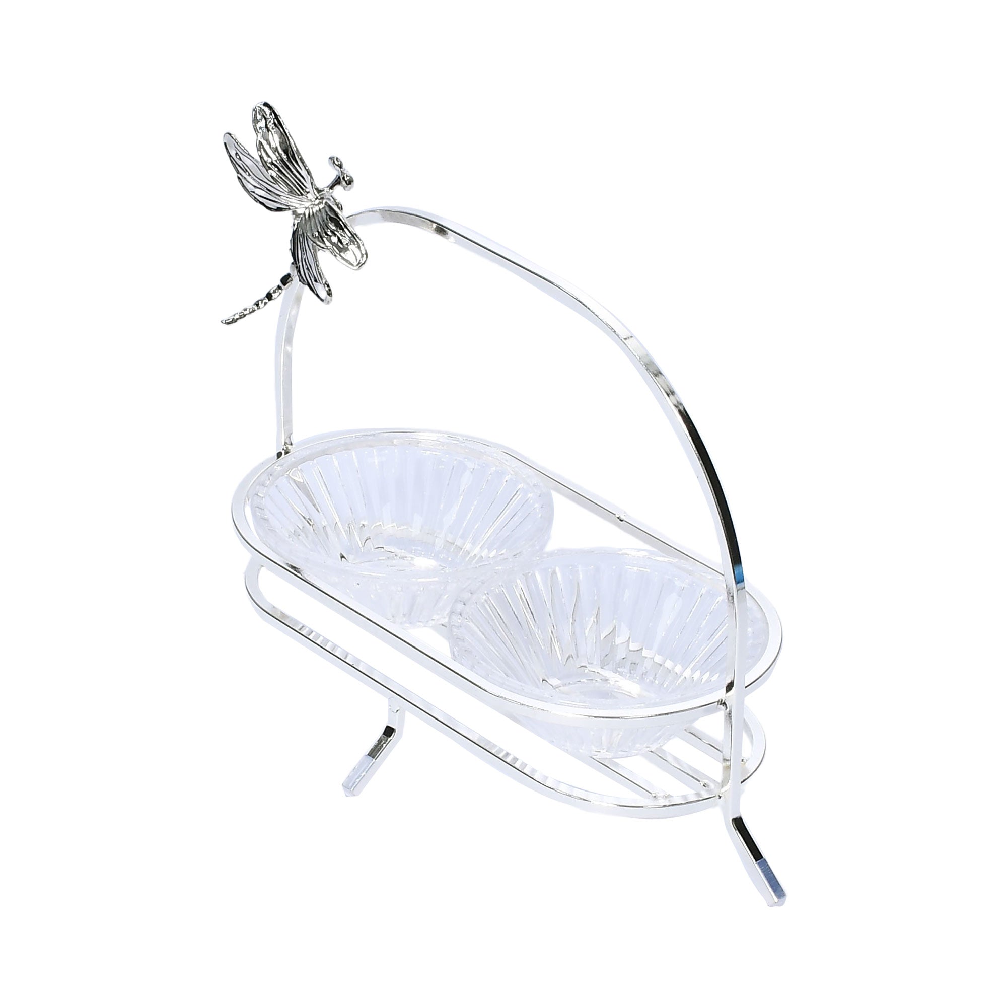The Ele 4PM Two-Tiered Serving Stand is an elegant and functional piece, perfect for presenting desserts, fruits, or small snacks at parties and gatherings. It features two round, clear glass tiers adorned with a unique textured and ridged pattern that adds visual interest and sophistication. Each tier is edged with a wavy rim accented by a delicate gold-toned border, enhancing the overall refined look. The tiers are connected by a sleek, silver-toned central rod topped with a smooth round finial, combining modern design with classic charm. The stand is elevated on a polished silver-toned base that provides both stability and a touch of style. Adding an enchanting detail, the stand is decorated with a charming dragonfly motif, making it a standout centerpiece for any occasion.