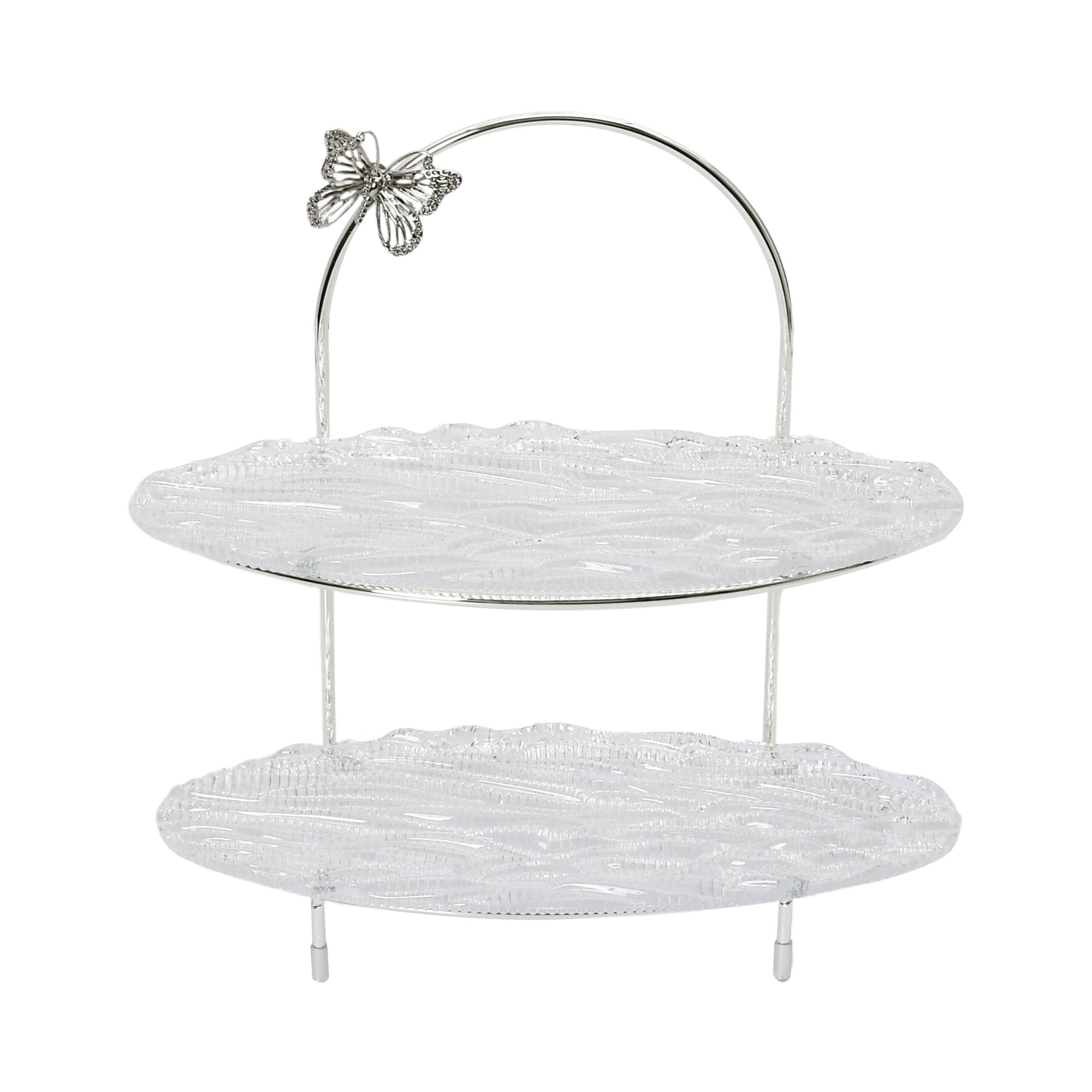 The Ele 4PM Two-Tiered Serving Stand with Butterfly Accent is a stunning and functional piece designed to elevate your entertaining experience. It features two oval-shaped glass plates, each showcasing a unique textured and ridged pattern that adds depth and visual interest. These clear glass tiers are supported by a sleek silver-toned metal frame, which includes a gracefully curved handle for effortless transport. Atop the handle rests a beautifully crafted and detailed butterfly accent, adorned with shimmering stones that catch the light and create a dazzling focal point. Perfect for presenting desserts, pastries, or appetizers, this elegant serving stand combines practicality with artistic flair, making it an exceptional addition to any gathering.