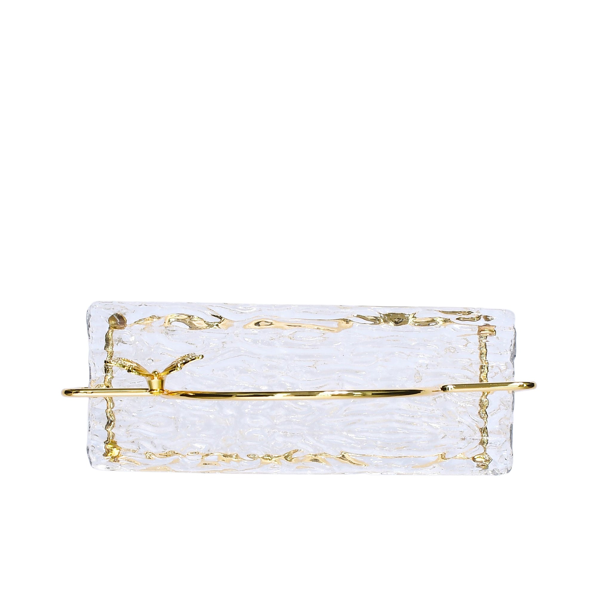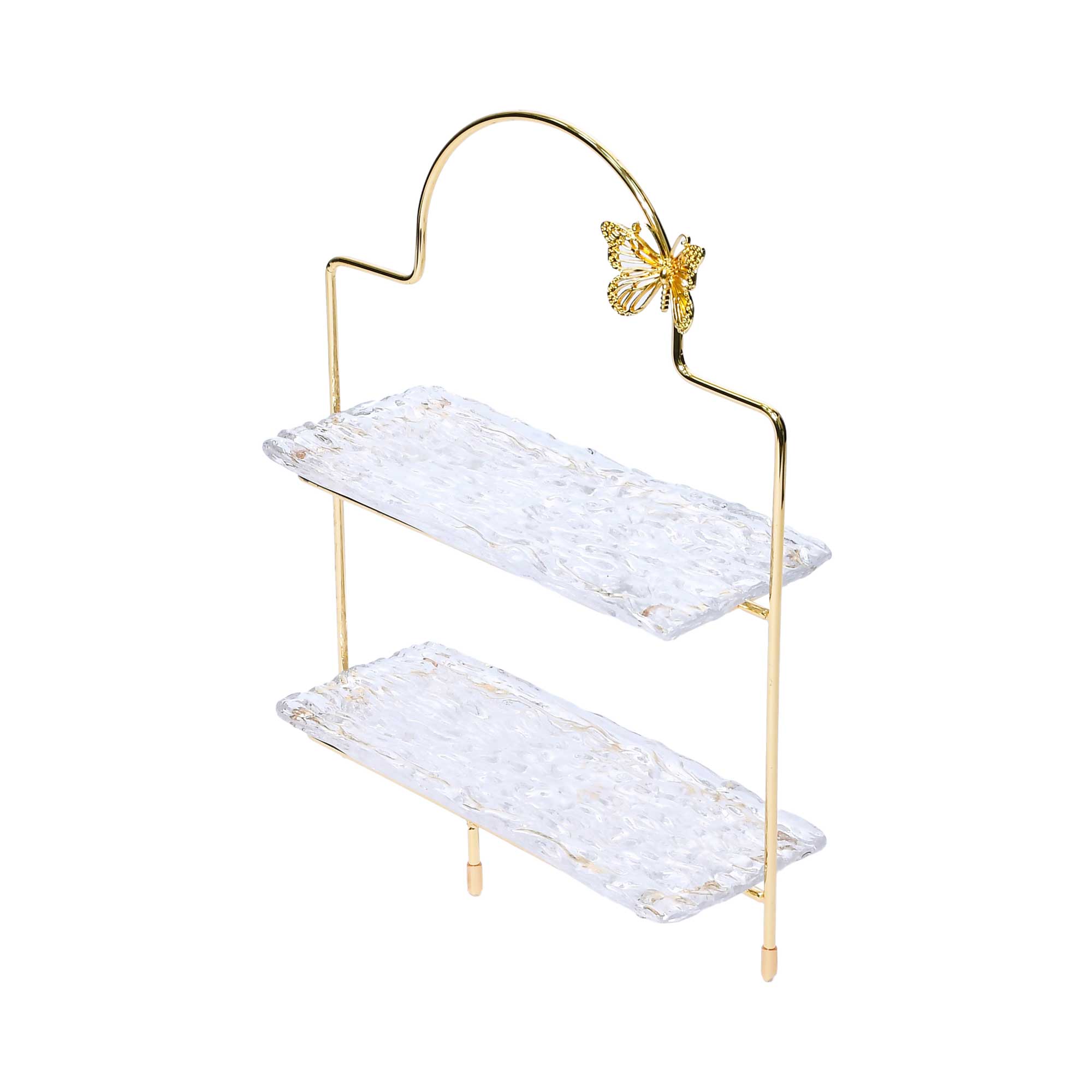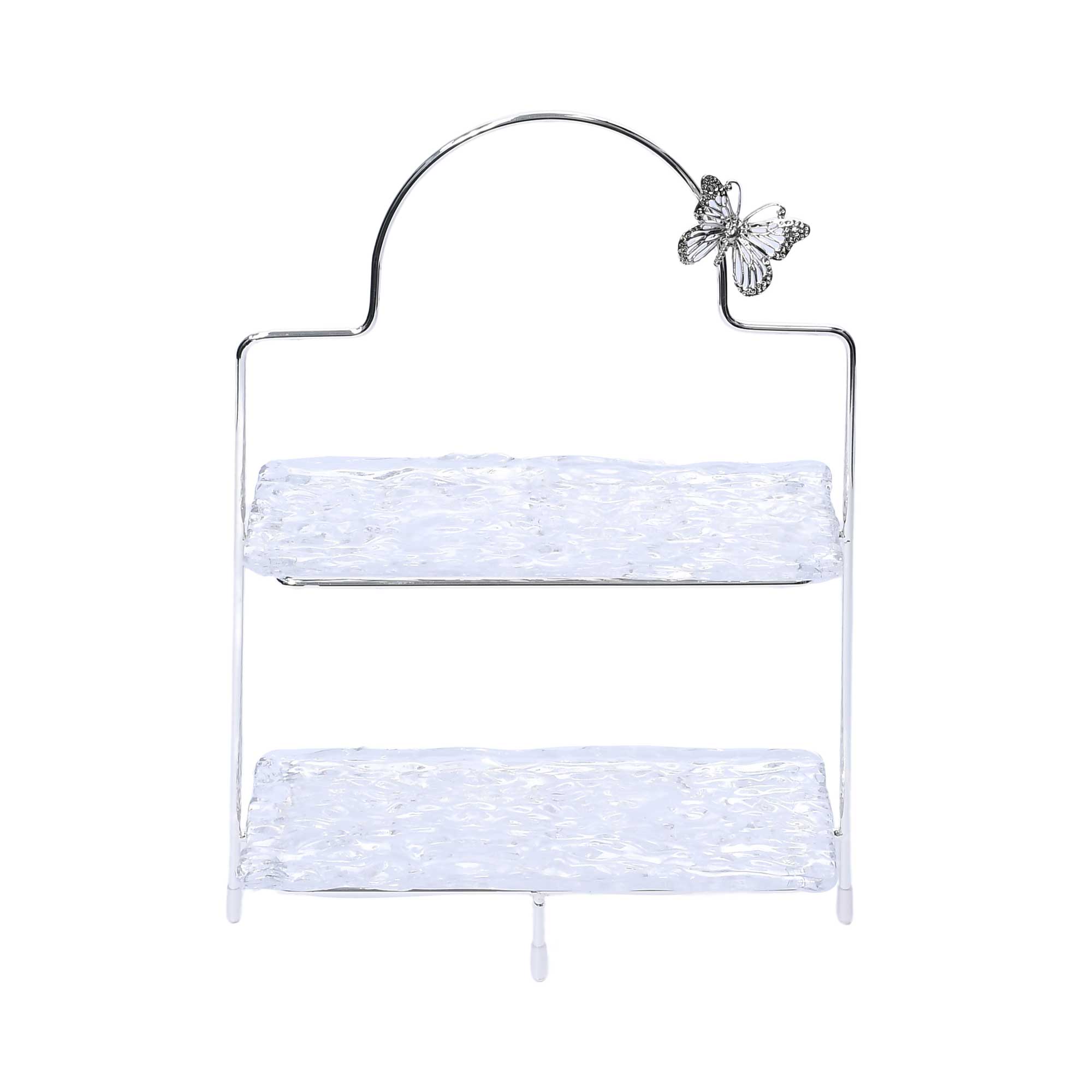 The Ele 4PM Cake Stand Butterfly is a beautifully designed serving set that combines elegance with functionality. It features a sleek, gold-toned metal frame that securely holds two clear, textured glass bowls, each adorned with a delicate fluted pattern that adds a touch of sophistication. The frame is thoughtfully designed with a central dividing bar, providing stability and a balanced presentation. Adding a unique and eye-catching element to the stand is the intricately crafted Butterfly accent perched atop the handle, which serves as both a decorative highlight and a convenient grip. This charming cake stand is perfect for showcasing desserts or appetizers while adding a graceful and whimsical touch to any table setting.