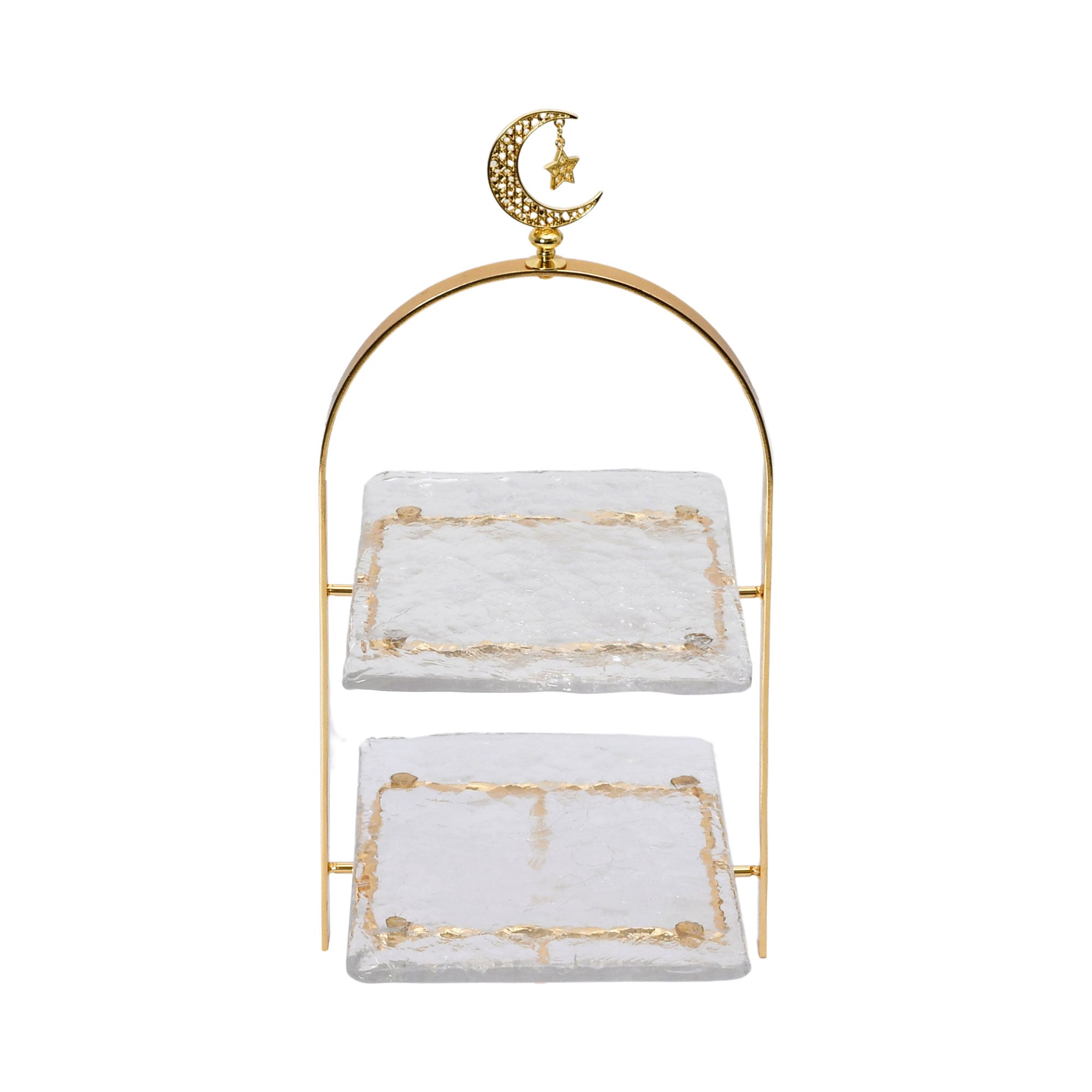 • Details: Wavy-edged glass plates; gold trim; ridged texture; silver-toned stand with orb finial