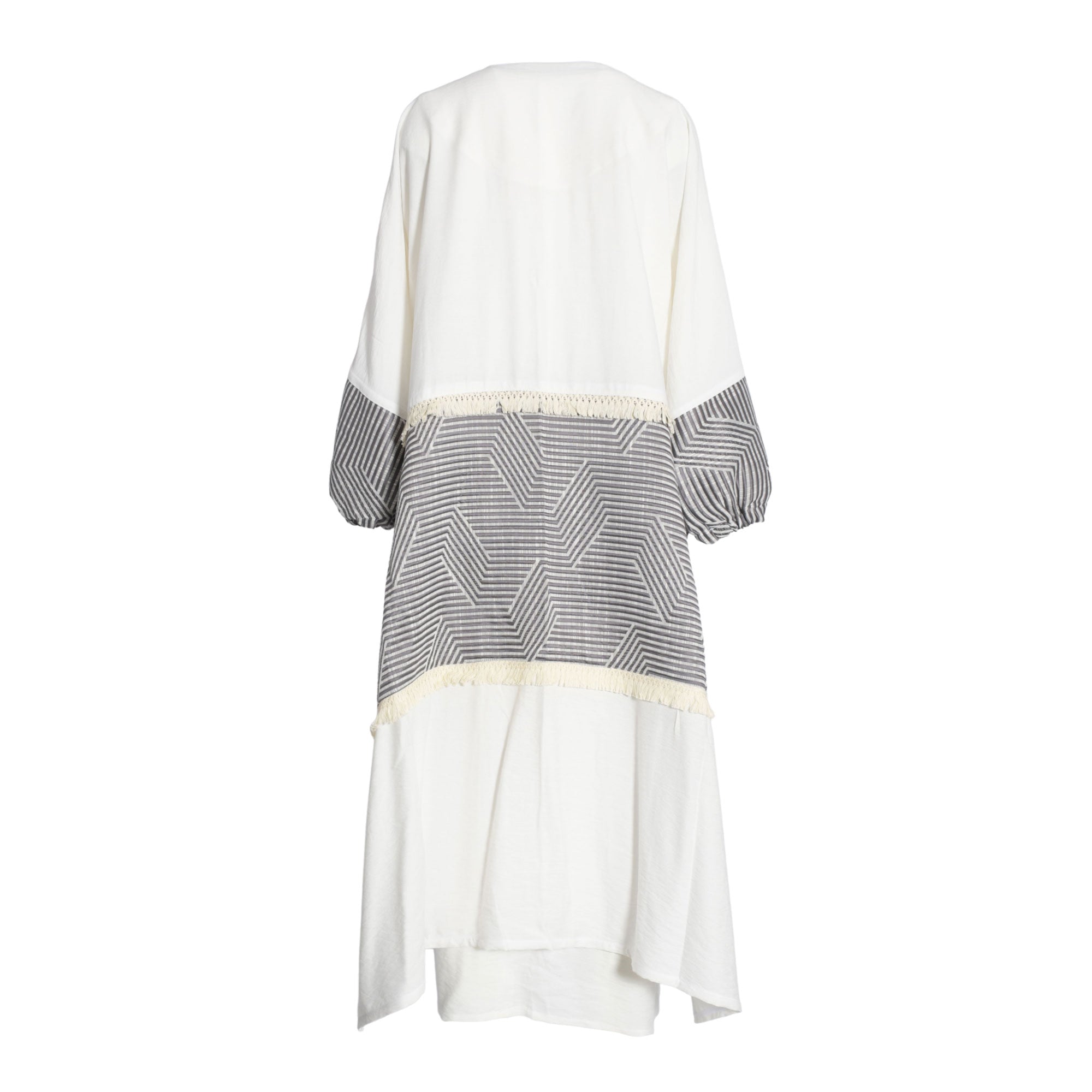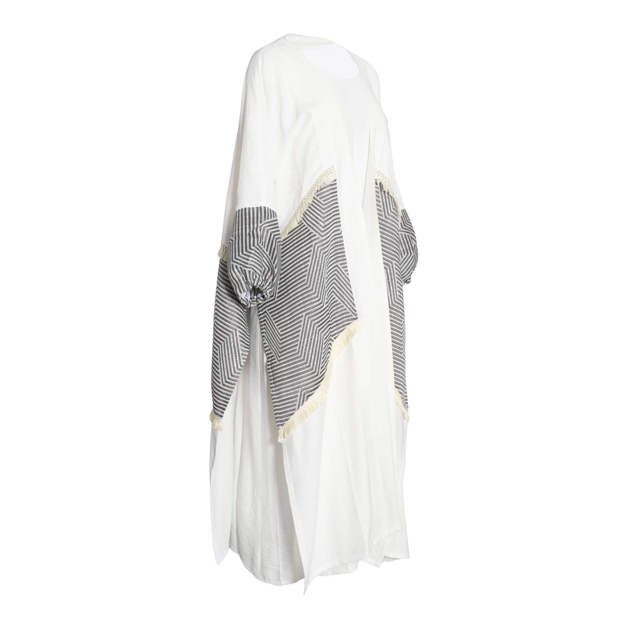 | This Fahm Dress & Abaya Set is the perfect combination of style and comfort. The White free size dress is simple yet elegant, with a round neck and plain interior. The exterior is a long abaya with a front open closure and long elasticated sleeves adorned with grey zig zag stripes and fringe detail on the sleeves and waist across the back. It also features slits on both sides, making it easy to move around in. The fine fabric ensures a comfortable and breathable fit all day long. Whether you're attending a special occasion or just want to look stylish, this set is sure to turn heads. SPECIFICATIONS: