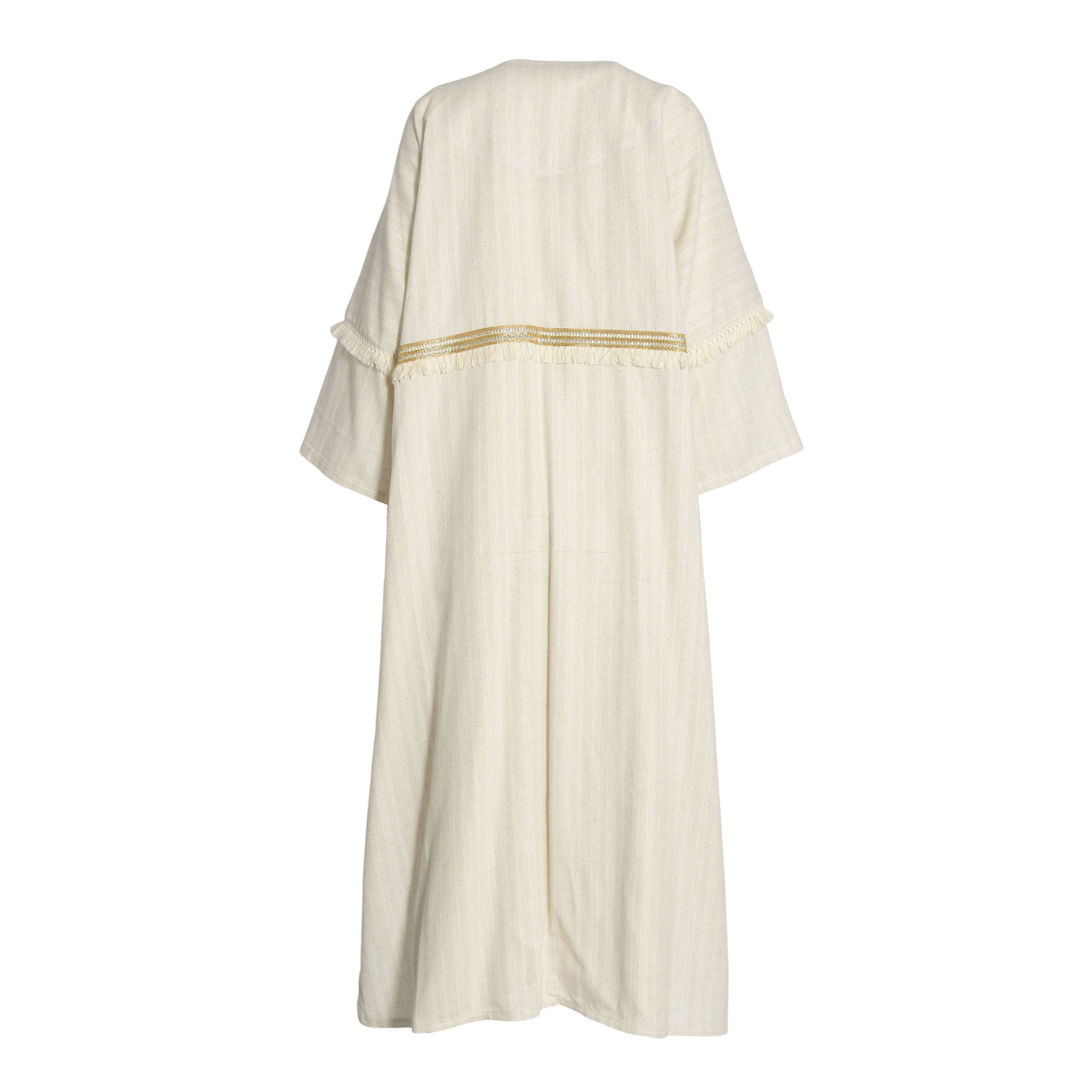 This Fahm Dress & Abaya Set is the perfect combination of style and comfort. The beige free size dress is simple yet elegant, with a round neck and plain interior. The exterior is a long abaya with a front open closure and long elasticated sleeves adorned with multicolor embroidery and fringe detail on the sleeves and waist across the back. It also features slits on both sides, making it easy to move around in. The fine fabric ensures a comfortable and breathable fit all day long. Whether you're attending a special occasion or just want to look stylish, this set is sure to turn heads. SPECIFICATIONS:
