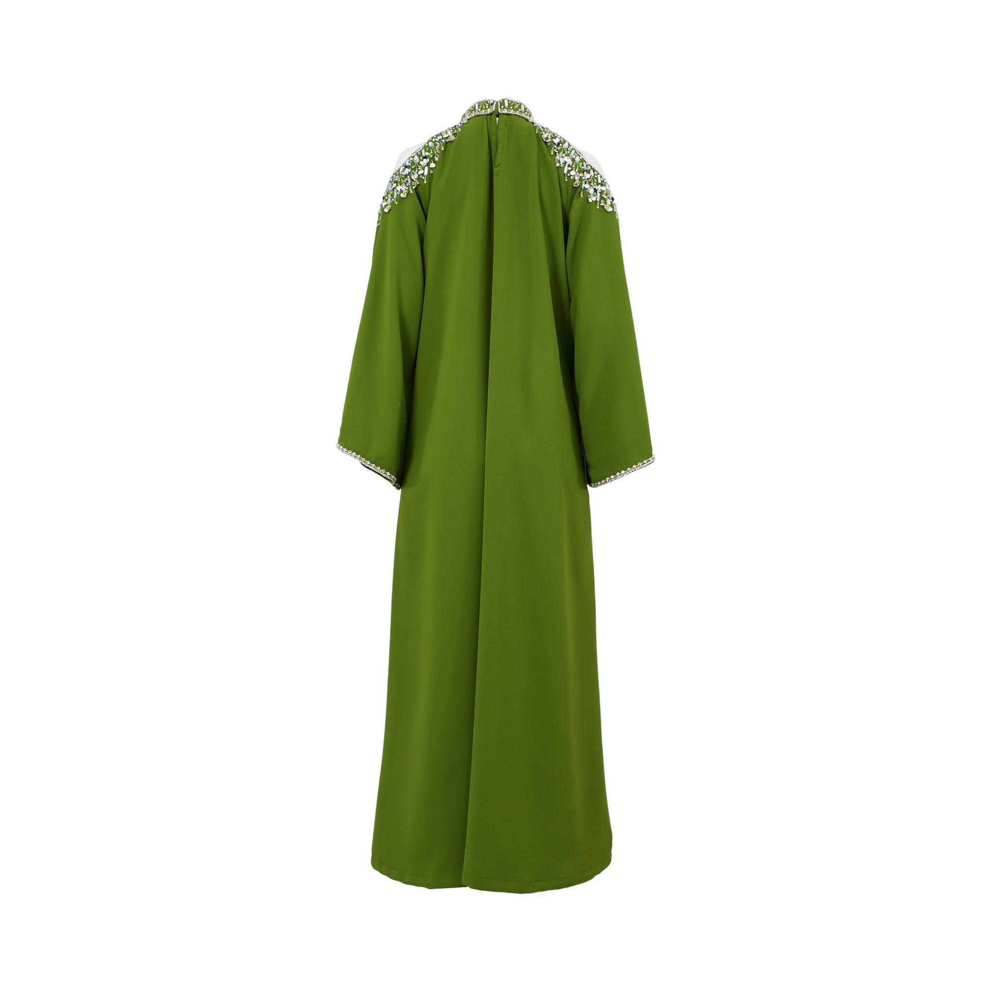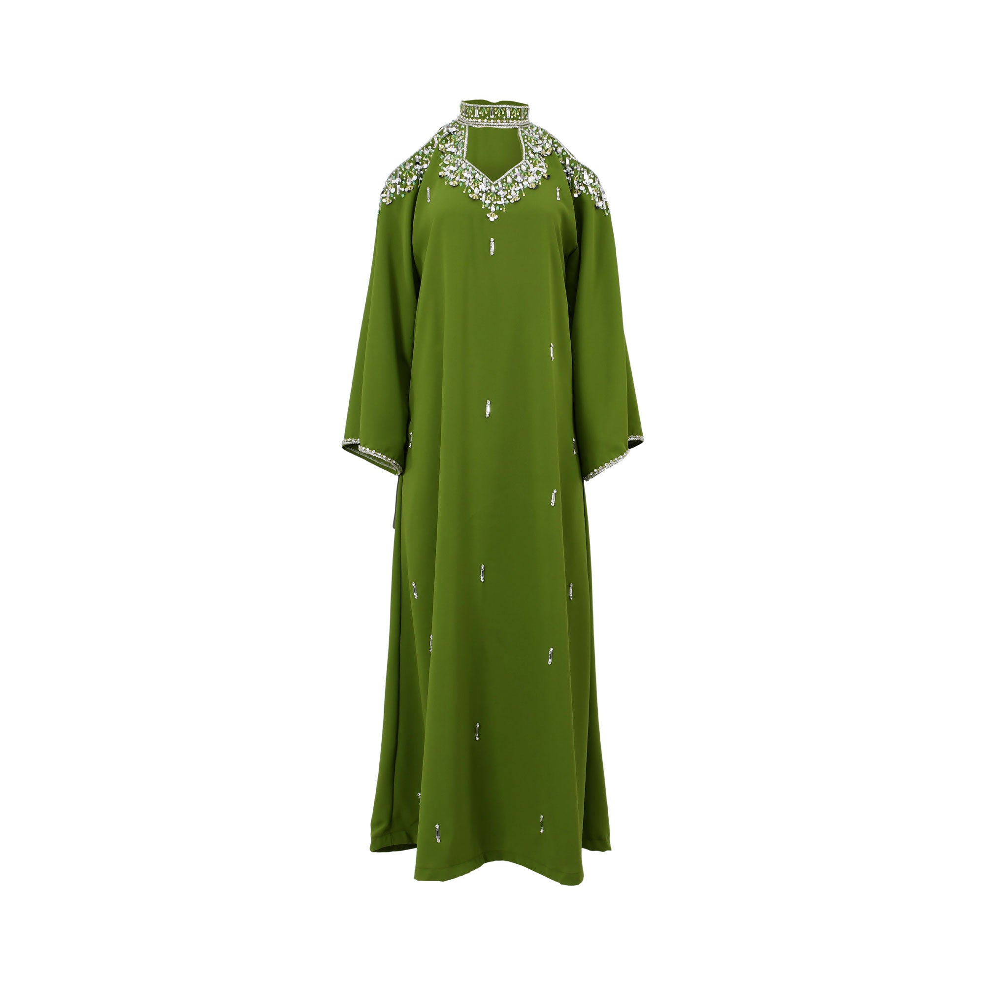 Embrace sophisticated elegance with this distinctive women's olive green abaya or dress by Iklé, a graceful piece that beautifully combines a unique color palette with intricate detailing. This stunning garment is an ideal choice for special occasions, formal gatherings, or festive event.