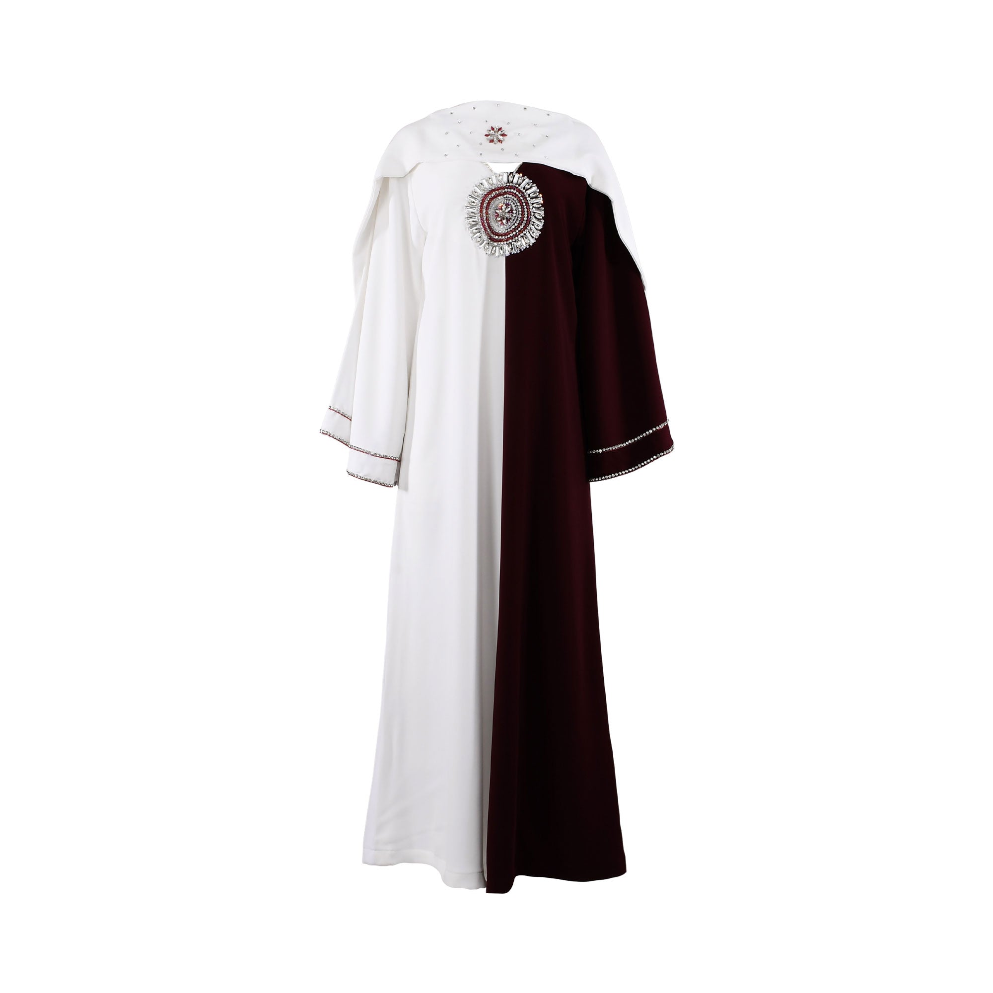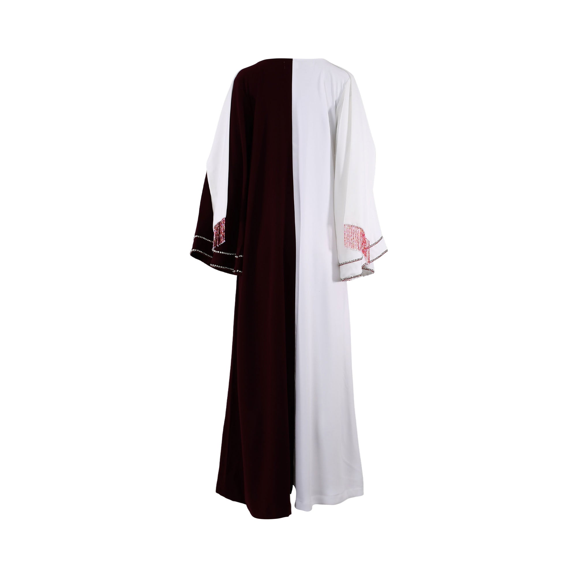 This stunning full-length piece features a striking vertical split design, with one half in crisp white and the other in a rich, deep maroon or burgundy. The flowing maxi silhouette drapes beautifully, offering both modesty and grace. The design includes a refined high neckline.