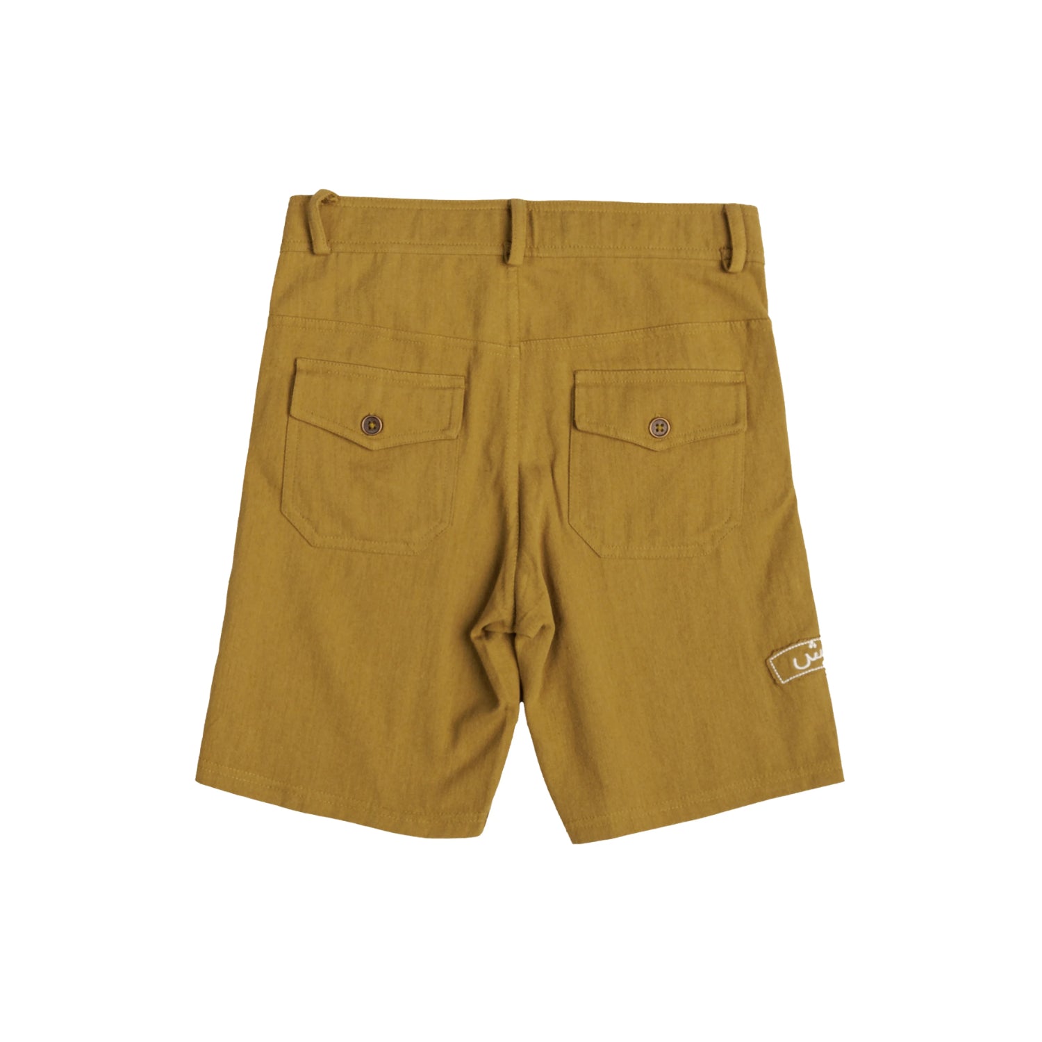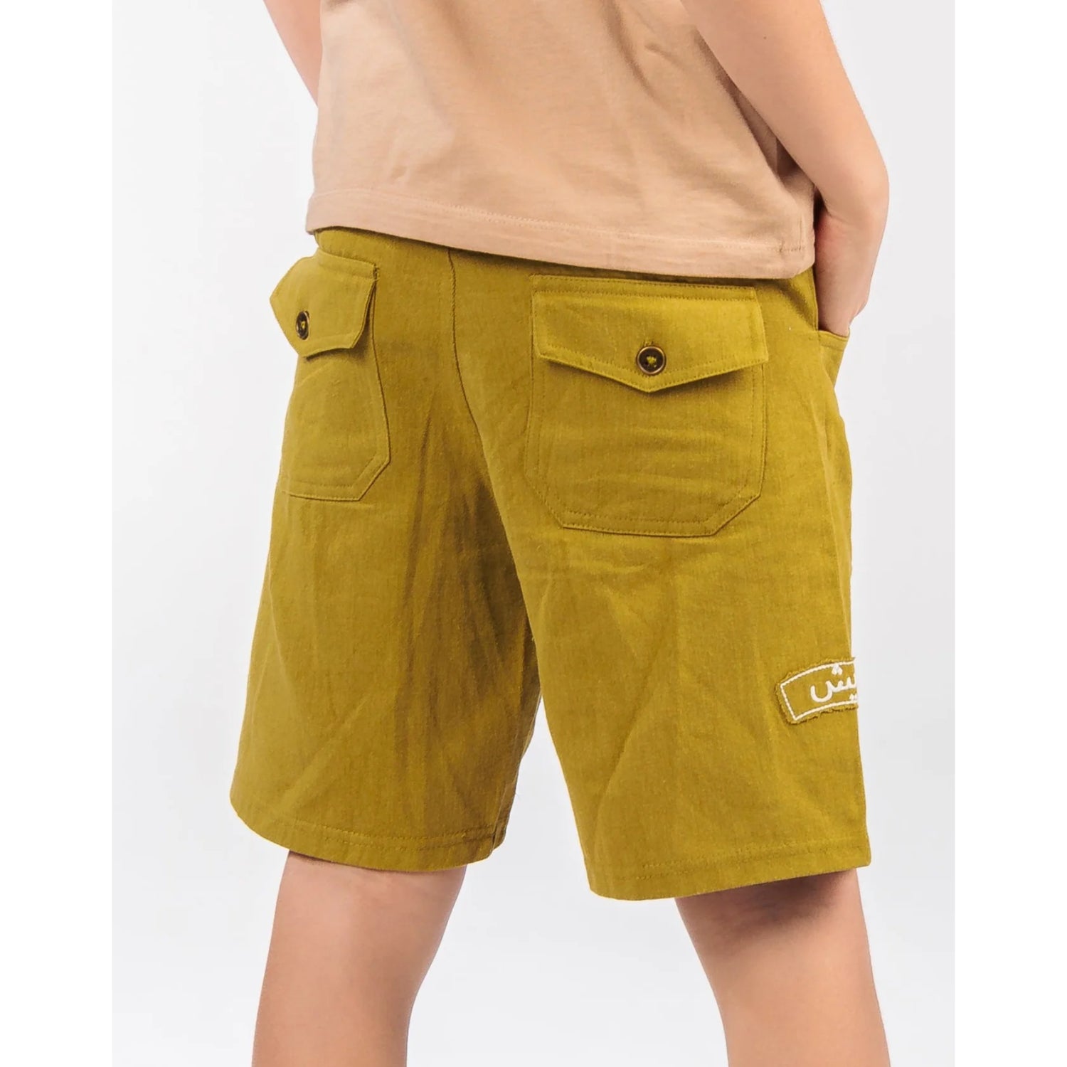 The Ein Ghein Kids Boy's Green Shorts are a stylish and comfortable addition to any young boy's wardrobe, crafted from organic cotton woven fabric for a soft feel and durability. These green shorts feature a concealed zipper and button closure for a secure fit, along with four slip-in pockets for added convenience. Adorned with white embroidery showcasing the Arabic phrase "Take it Easy," they promote a sense of relaxation and mindfulness. These shorts can be effortlessly paired with the matching Khutwa T-shirt from the same collection, creating a coordinated and fashionable look. Available in multiple sizes, these shorts are perfect for active little ones who value both comfort and style.