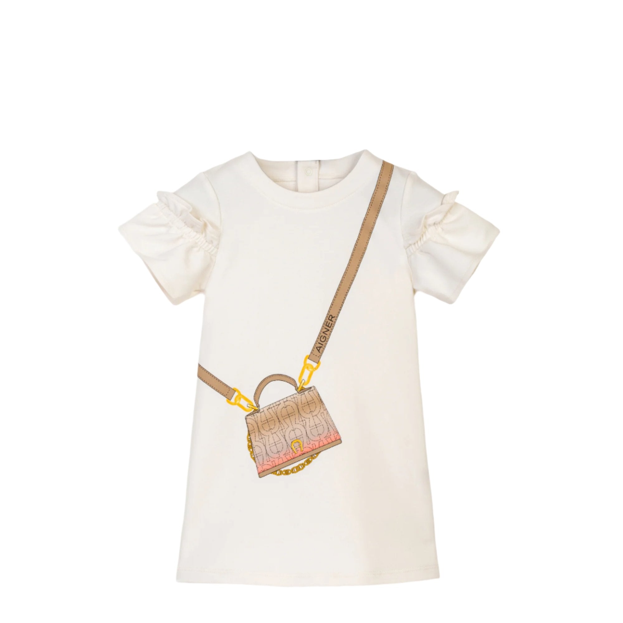 The Aigner Kids Baby Girl's White Dress is a stylish and comfortable piece for your little one. Made from soft cotton jersey, it ensures a gentle and delicate feel on the skin. The dress features a crossbody bag design with a logo print on the front, giving it a trendy and playful look. The ruffled sleeves with an elasticated band not only add a touch of cuteness but also provide a structured shape to the dress. The dress fastens with poppers at the back, making it easy to put on and take off. Perfect for any occasion, this dress is a must-have for any fashion-forward baby girl.