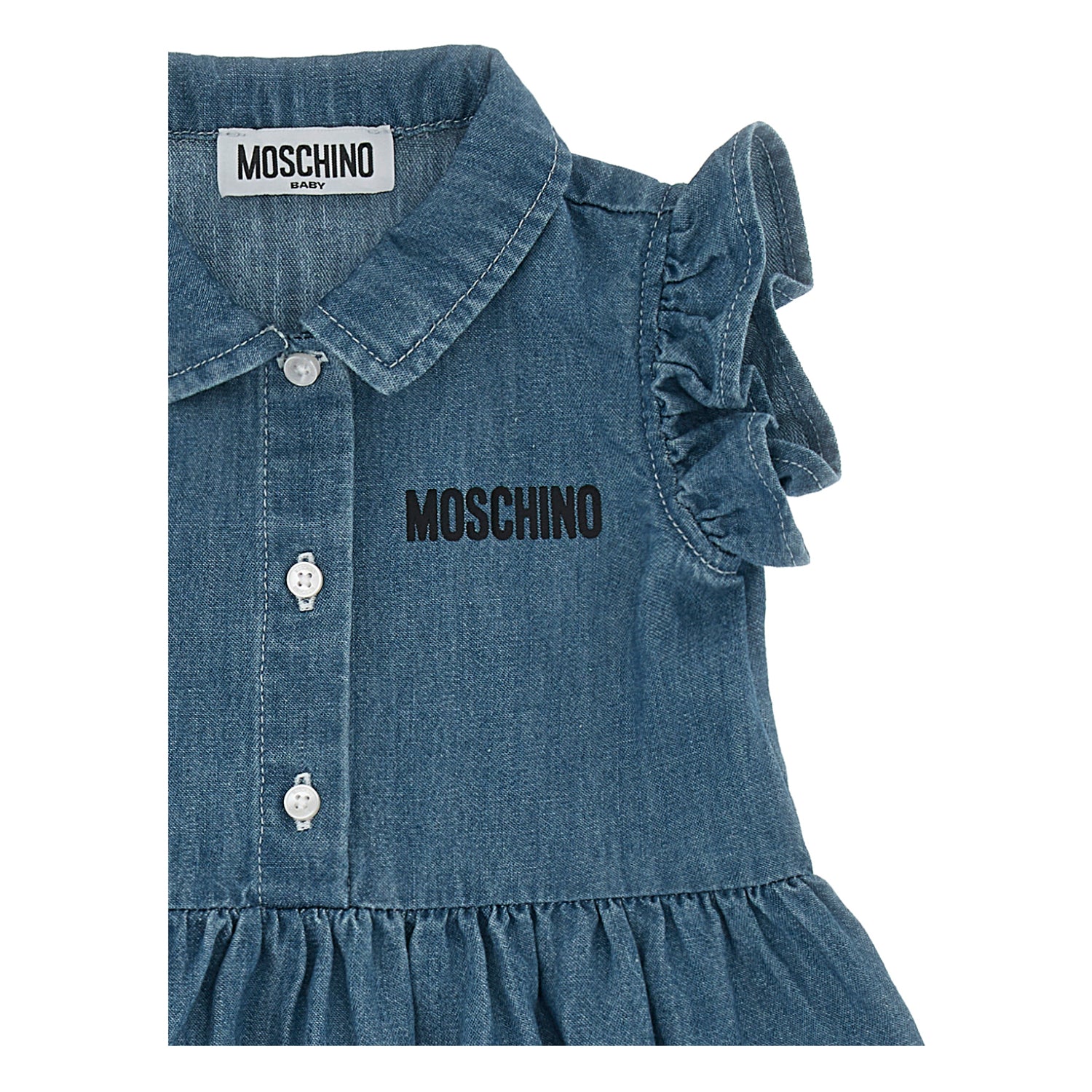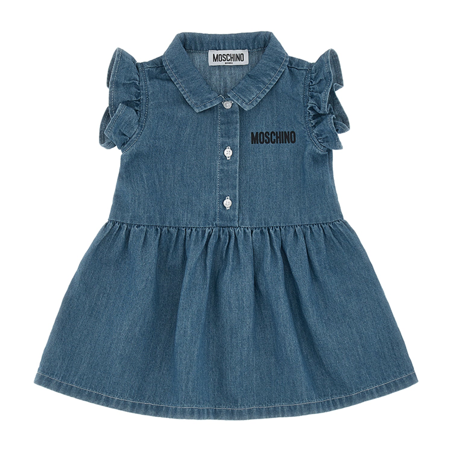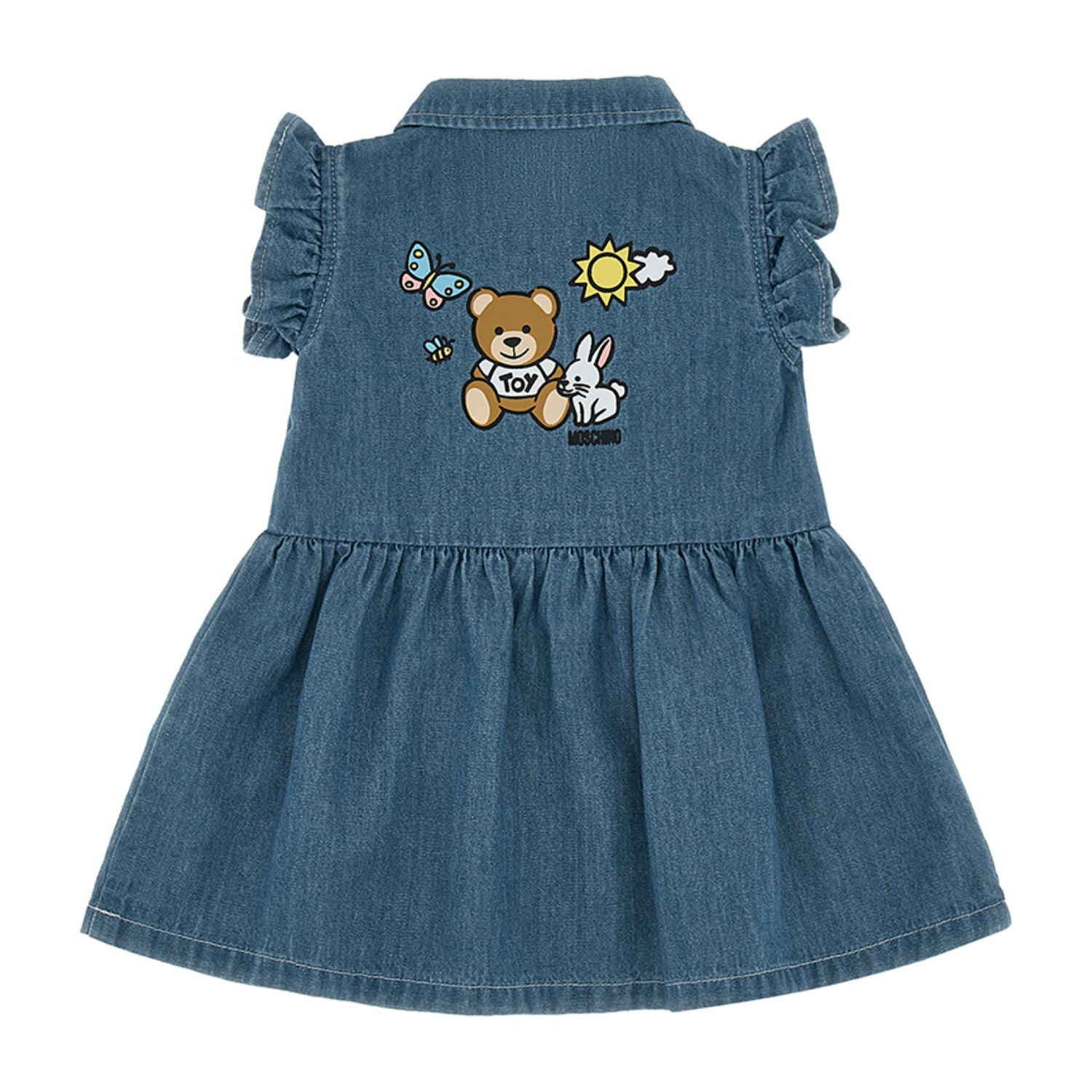 | The Moschino Kids Baby Girl's Waves Blue Dress is a charming and stylish piece that perfectly blends playful design with high-quality craftsmanship. Featuring a delightful back print of the iconic Moschino teddy bear set against a nature-inspired backdrop, the dress adds a fun and whimsical touch. The front of the dress is adorned with the Moschino logo print, creating a standout contrast against the vibrant blue fabric. Designed with a classic shirt collar and sleeveless cut, it offers comfort and ease of movement, while the ruffled armholes add a sweet and feminine detail. The front button closure enhances practicality and style, making it simple to dress and undress. The flared skirt completes the look with a graceful and airy silhouette, making this dress an ideal choice for any little girl’s wardrobe. SPECIFICATIONS • Brand: Moschino Kids • Gender: Girl • Charming and stylish design blending playfulness with high-quality craftsmanship • Features a delightful back print of the iconic Moschino teddy bear against a nature-inspired backdrop • Front adorned with Moschino logo print, providing a standout contrast on vibrant blue fabric • Classic shirt collar and sleeveless cut for comfort and ease of movement • Ruffled armholes add a sweet and feminine detail • Front button closure enhances practicality and style for easy dressing • Flared skirt creates a graceful and airy silhouette • Ideal choice for a little girl’s wardrobe, combining fun and elegance • Fabric: Cotton 100% • Washing Instruction: Machine wash (40*C) • Do not dry clean • Do not tumble dry • Do not bleach About Brand Moschino is an Italian luxury fashion house founded in 1983 by Franco Moschino. Renowned for its playful, eccentric, and sometimes irreverent designs, the brand has carved a unique niche in the fashion industry by blending high fashion with a bold, whimsical spirit. Moschino’s collections often feature vibrant colors, quirky prints, and innovative use of materials, reflecting a sense of humor and creativity that challenges conventional style norms. |