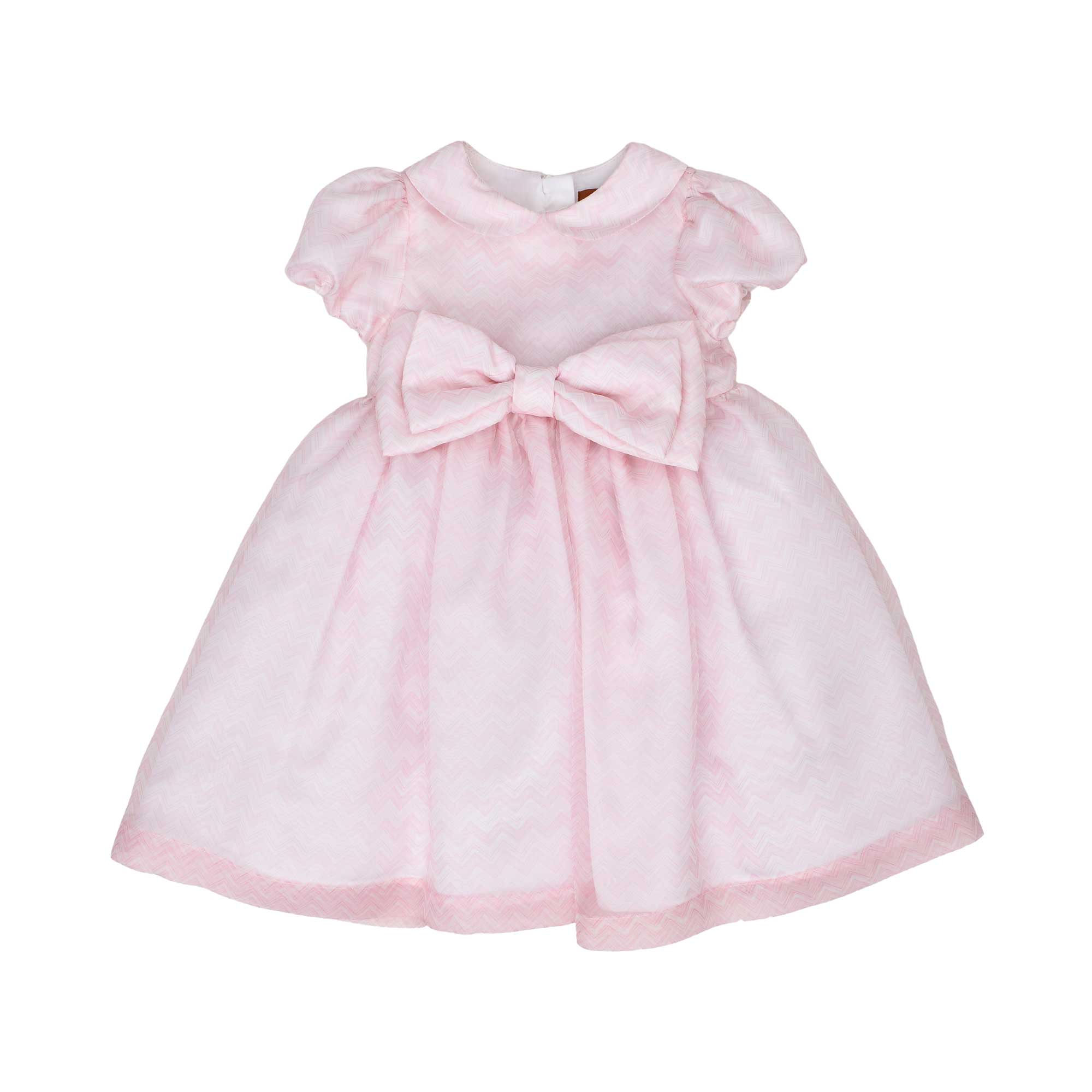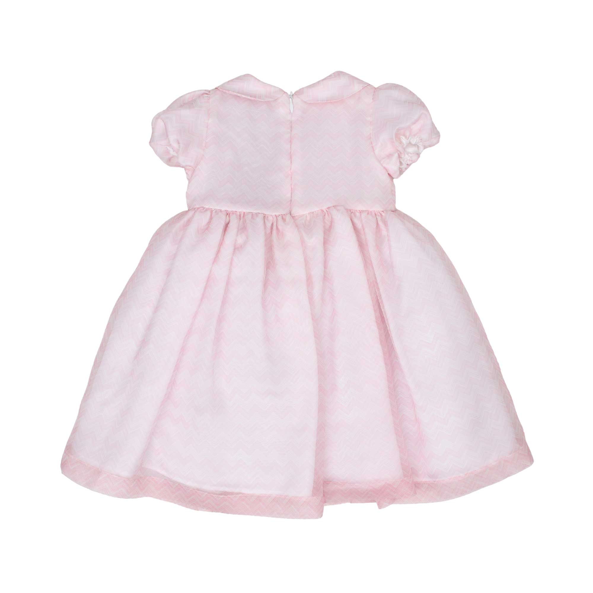 This is a beautiful light pink baby girl's dress featuring a subtle, woven chevron pattern throughout the fabric.