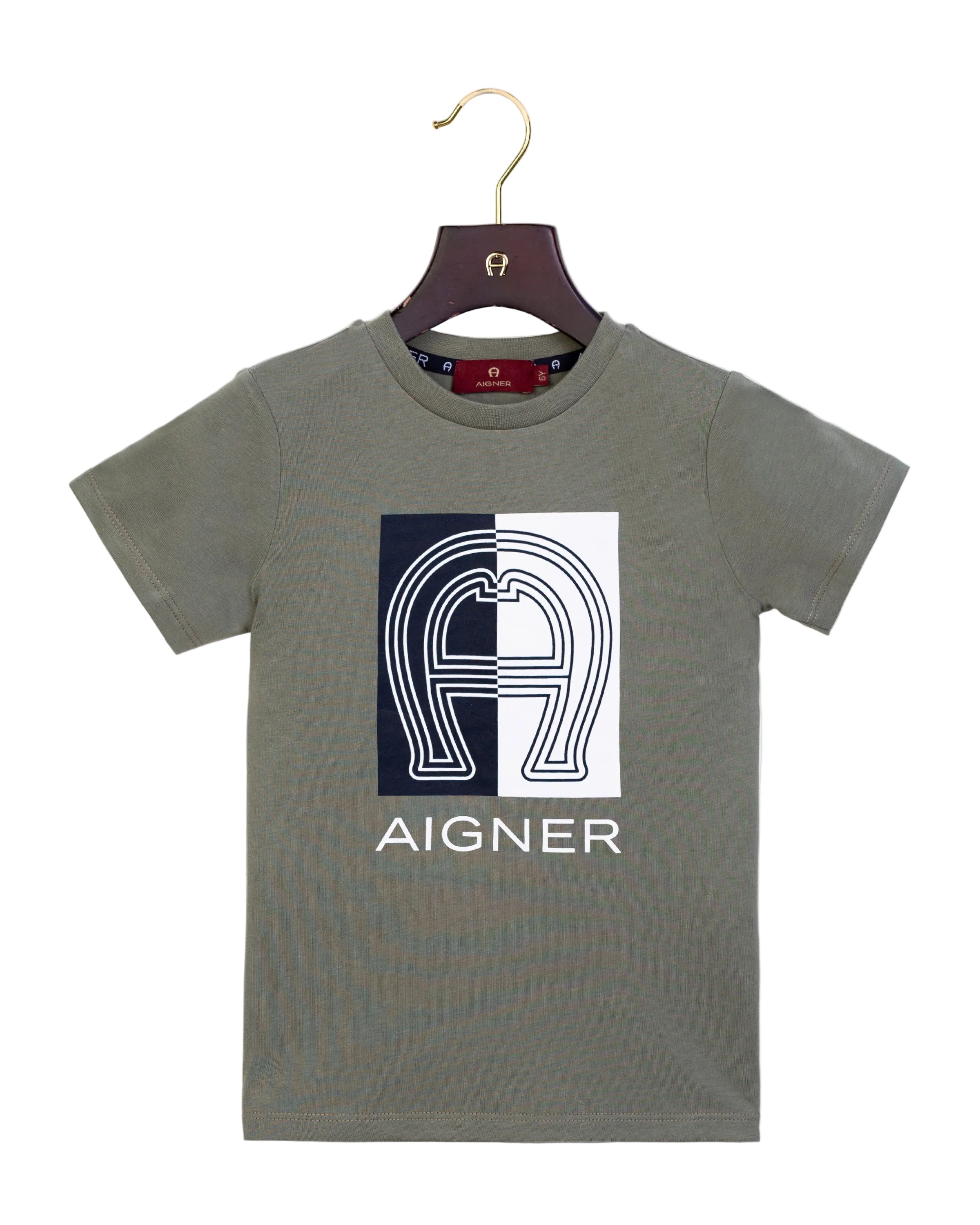 • Graphic Detail: Showcases a bold, centered horseshoe "A" logo within a split navy and white square, accompanied by the "AIGNER" wordmark in crisp white lettering.