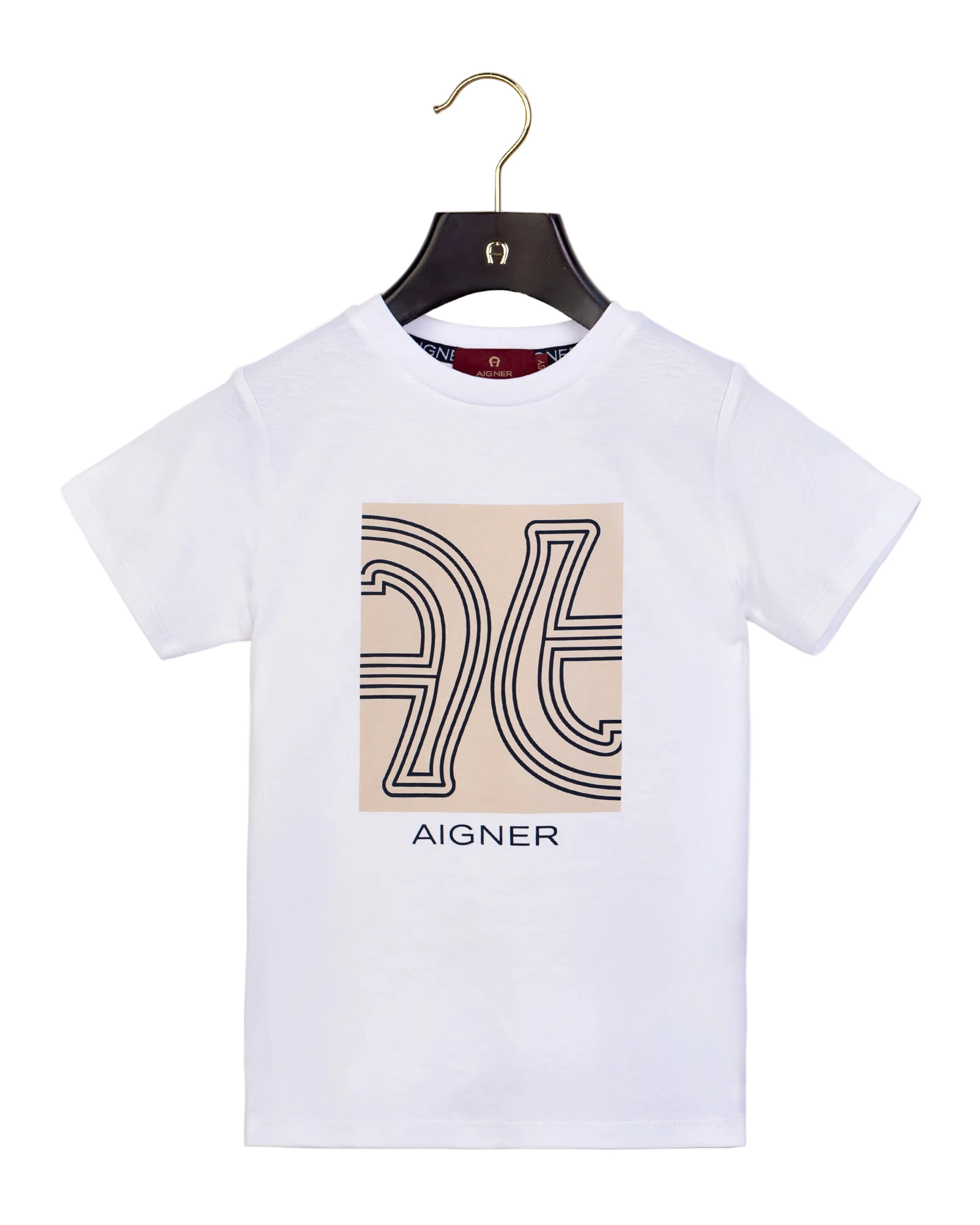 This crisp white T-shirt features an oversized, abstract interpretation of the brand's heritage horseshoe logo, set against a warm sand-toned background. Crafted from premium cotton, it offers a refined yet playful look for the young trendsetter.