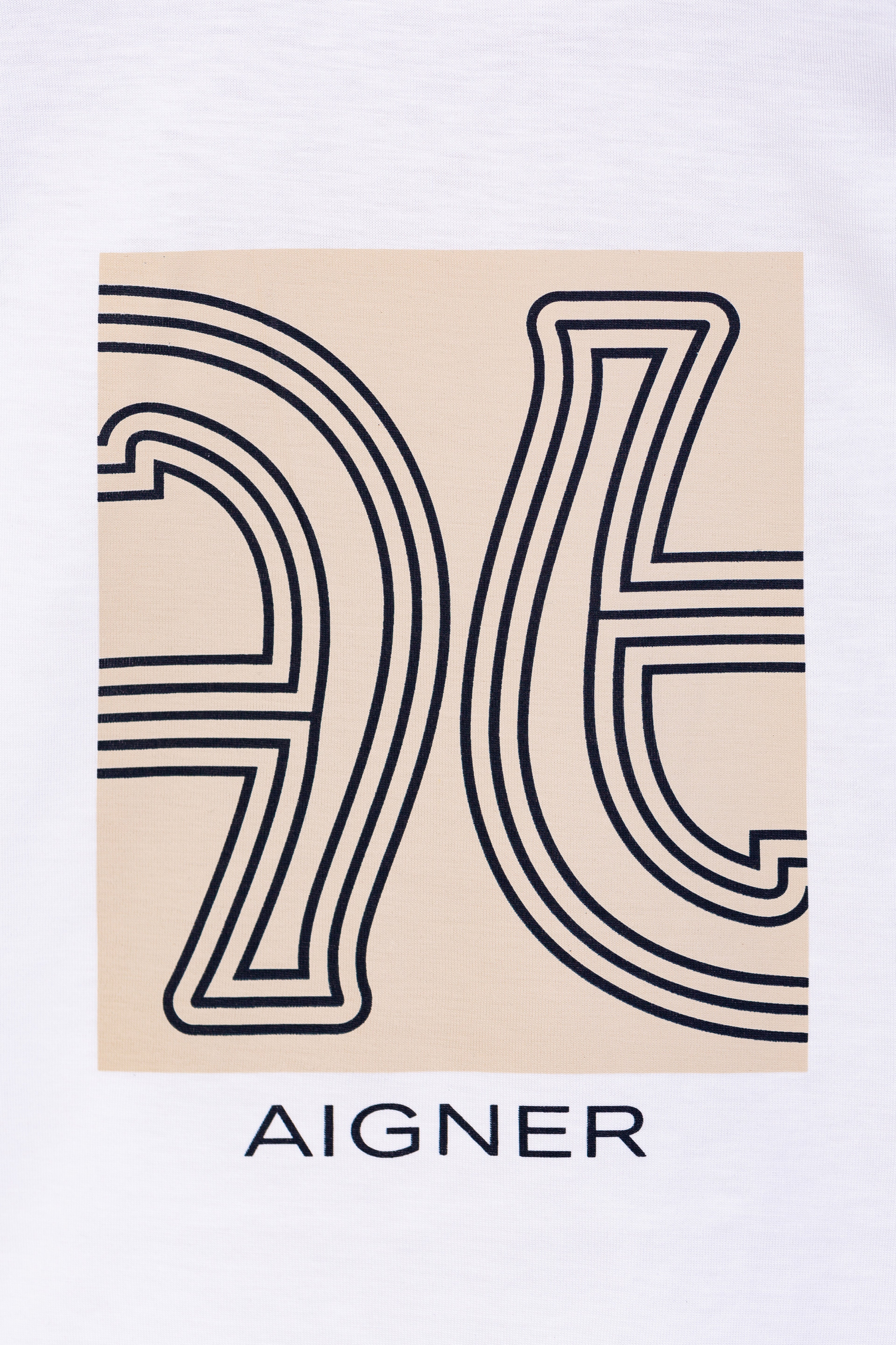 Graphic Detail: Showcases a large, centered square graphic in a sand hue, featuring an abstract, navy-lined rendition of the horseshoe "A" logo and the "AIGNER" wordmark printed directly below.