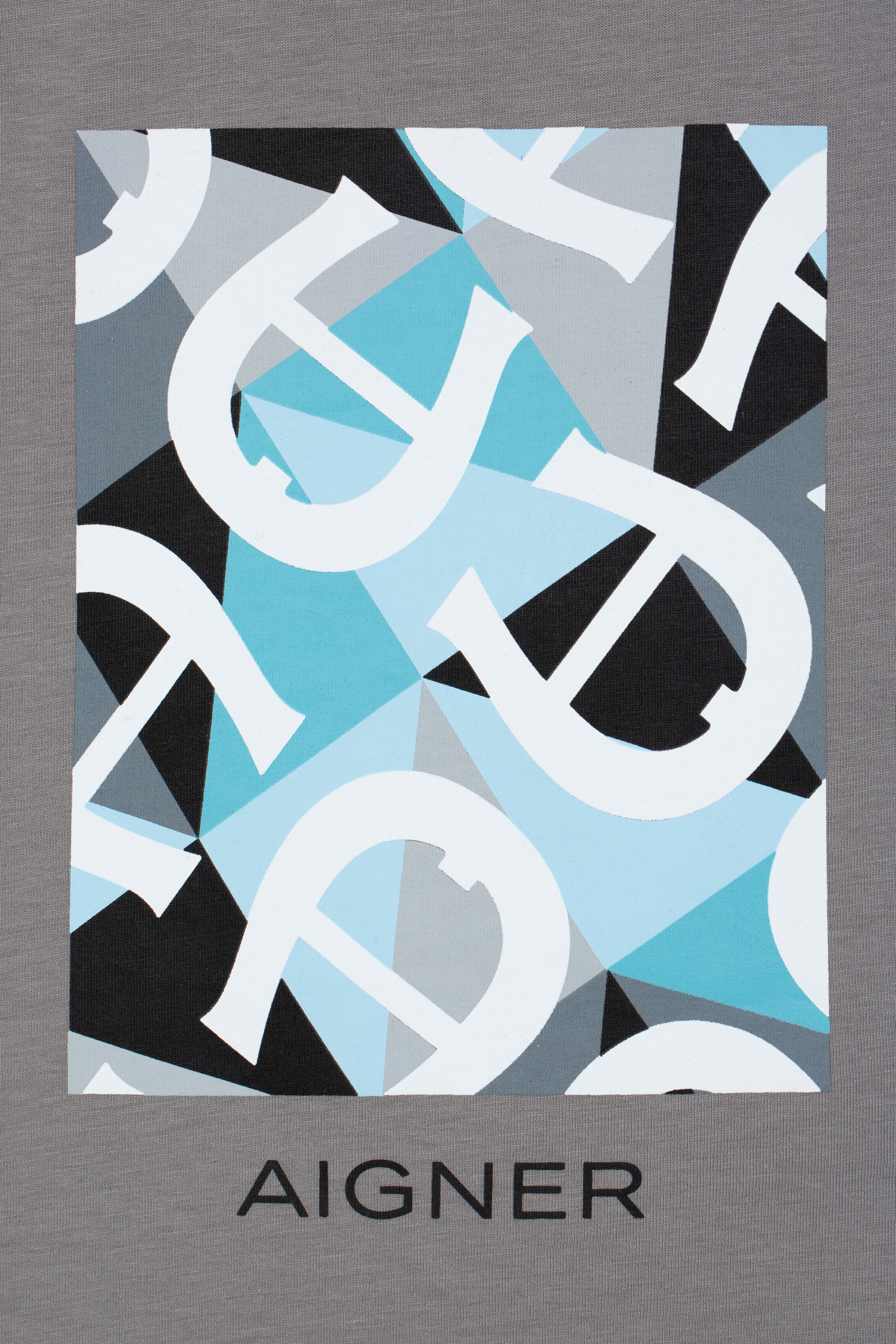 Graphic Detail: Showcases a central rectangular graphic containing an abstract collage of horseshoe "A" logos in turquoise, white, and black, with the "AIGNER" wordmark printed directly below.