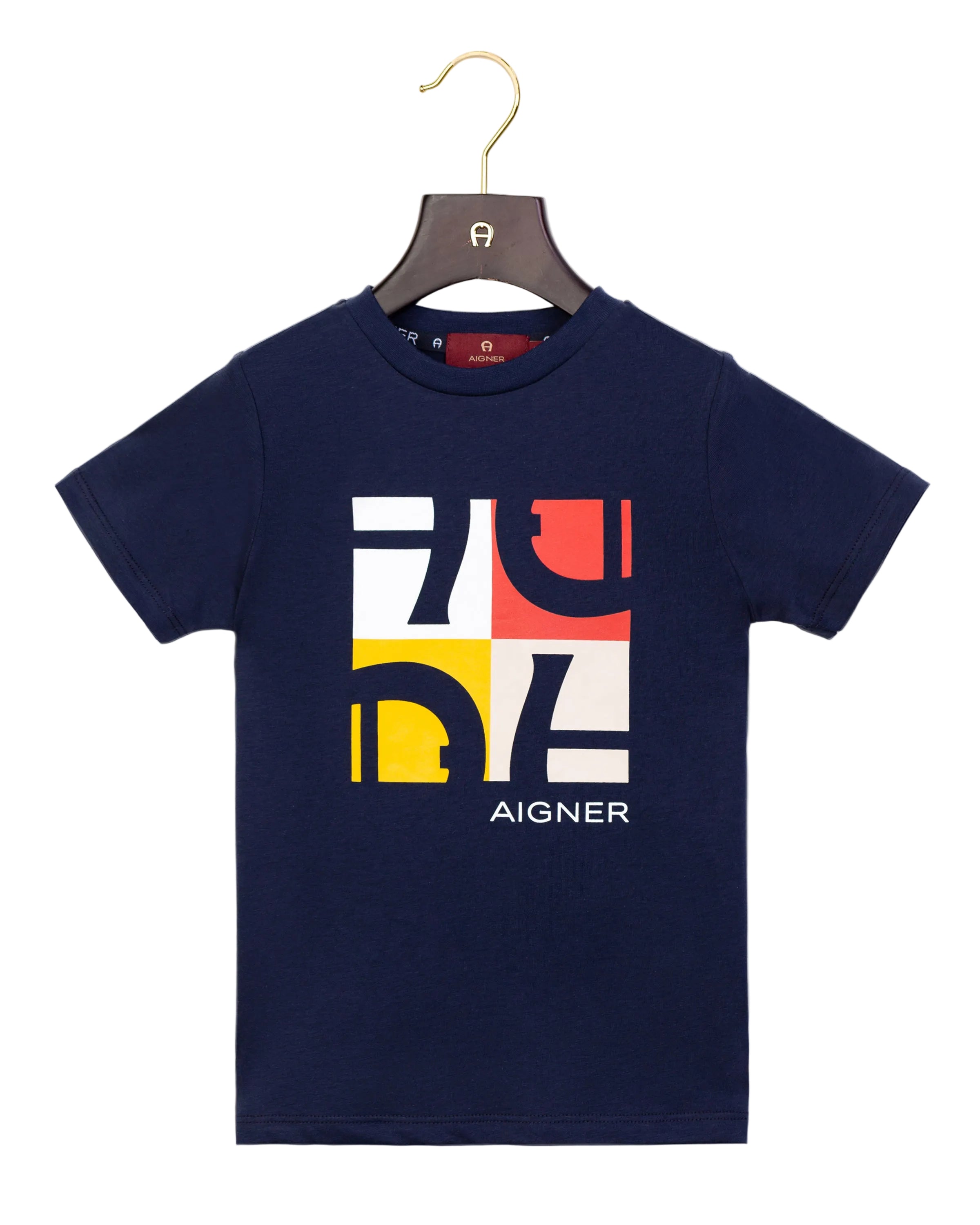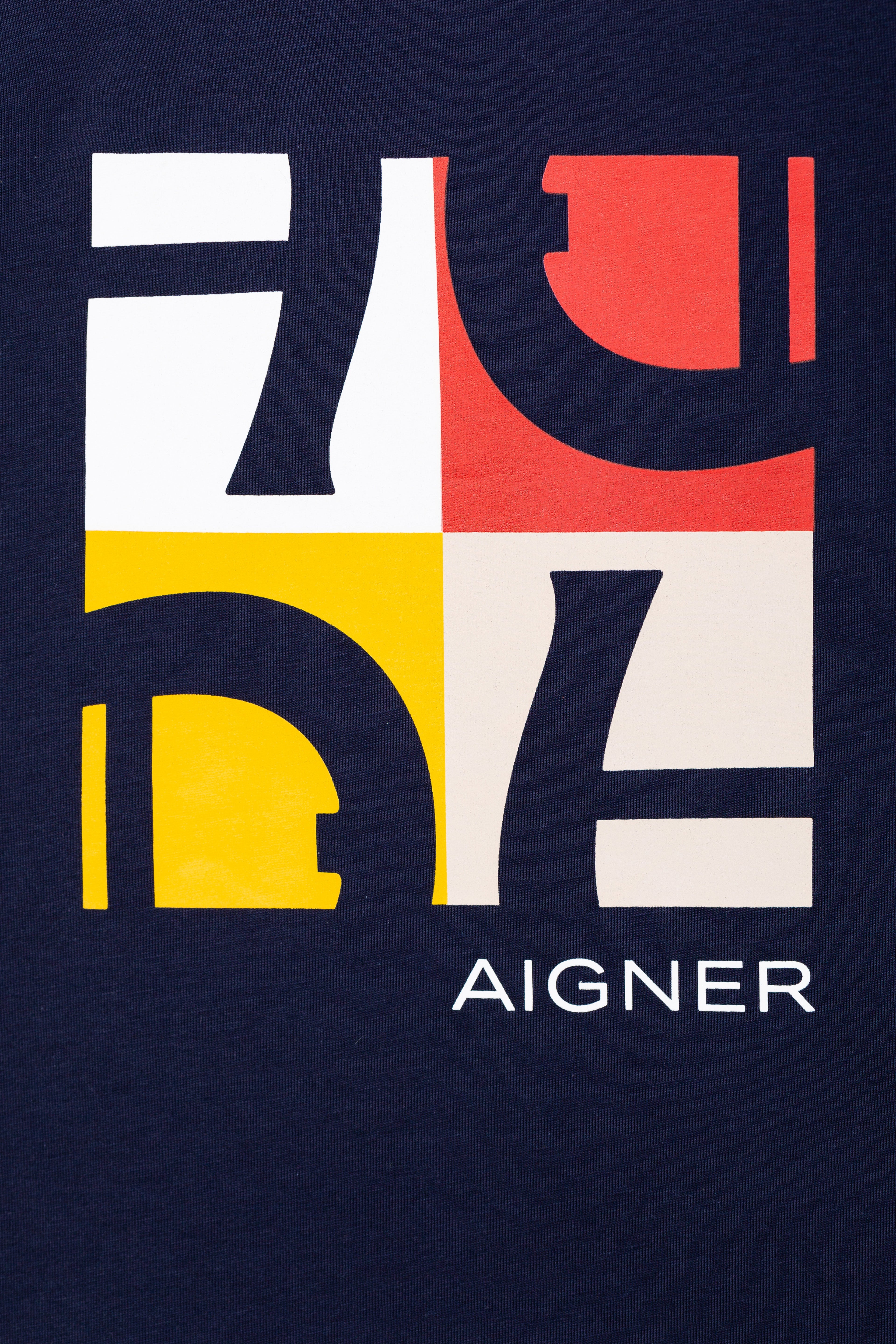 Graphic Detail: Showcases a central interlocking horseshoe logo ribbon in a striking palette of light blue, white, and red, finished with a crisp "AIGNER" wordmark printed directly below.